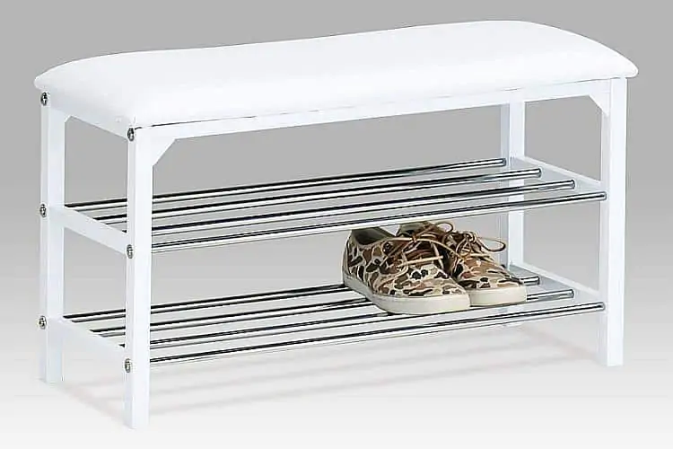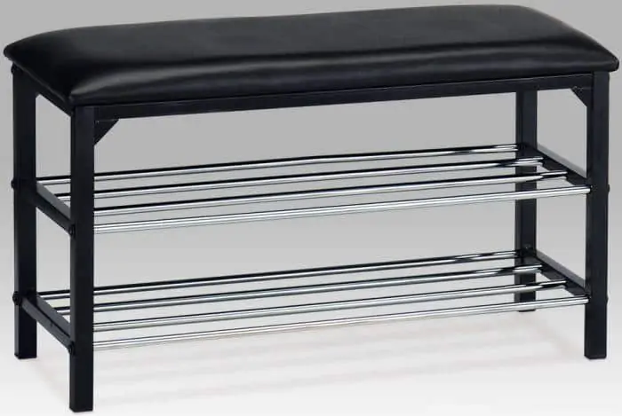 Praktický kovový botník / taburet se 2 odkládacími policemi. Čalouněný koženkou. Předsíňový botník je vyrobený jako 2 v 1, na taburetku si můžete sednout při zouvání či nazouvání bot a police se využijí jako botník. Chromové pruty v polici na odkládání bot lze lehce ošetřovat. Dodávaný v demontu.