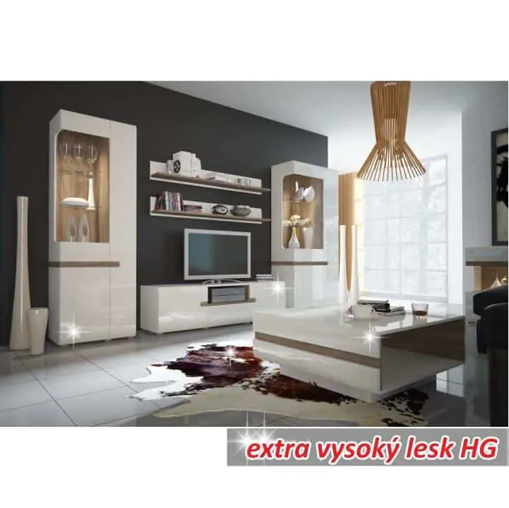 Provedení: Moderní vitrína z programu Lynatet je vhodná především na zařízení obývacích pokojů. Třídveřová vitrína v bílé barvě se vyznačuje moderními zaoblenými hranami a elegantními doplňky v tmavém dubu sonoma. V uzavřené části jsou dřevěné police a jedna zásuvka. Korpus je vyroben z laminované dřevotřísky odolné vůči poškrábání a vlhkosti, přední plochy jsou z MDF ve vysokém lesku. Doporučujeme dokoupit dvoubodové osvětlení LYNATET, které není součástí komody. Dodáváno v demontu.