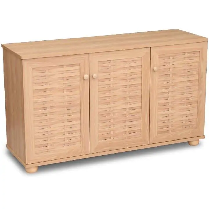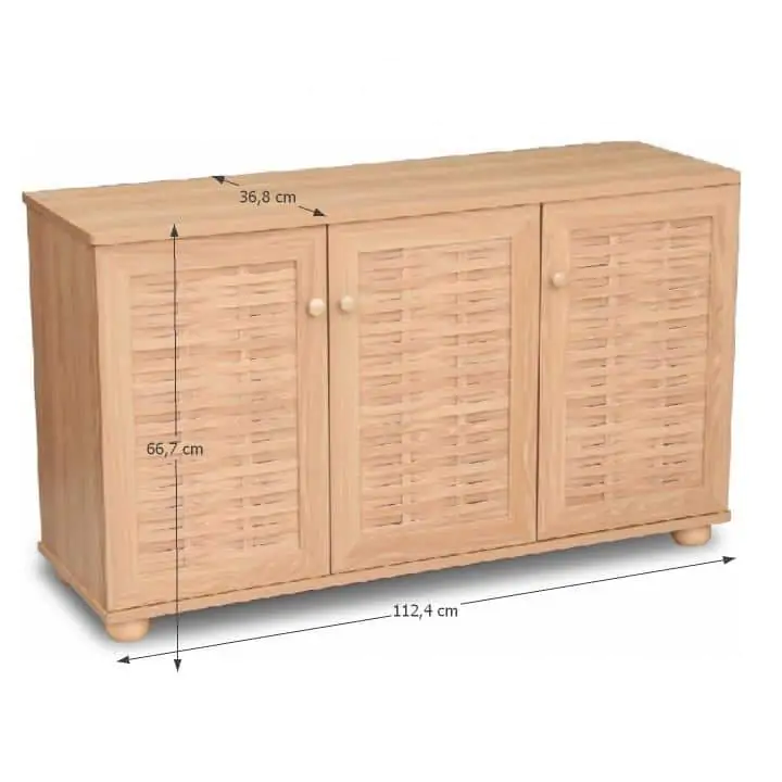 Provedení: Praktický třídveřový botník je vyroben z laminované MDF v barevném provedení natural (přírodní). Za levými i pravými dvířky se nachází 3 police. Nosnost police: 5 kg Dodáváno v demontu.