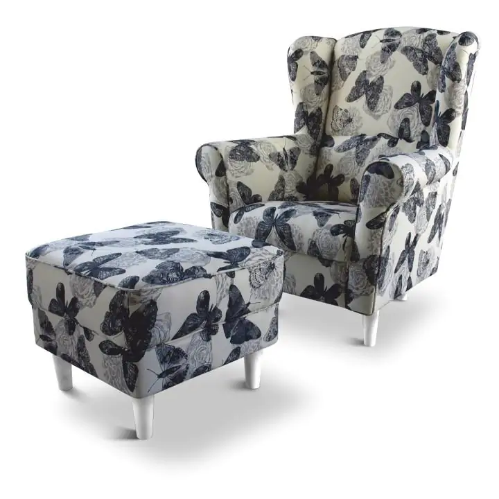 Provedení: Oblíbený typ křesla "ušák" je dodáván včetně taburetu pro maximální pohodlí a relaxaci. Křeslo s taburetem je vyrobeno v potahové látce Butterfly 1 v kombinaci dřevěných nožiček v bílé barvě. Rozměry (ŠxVxH) křeslo - 86x105x72 cm, výška x hloubka sezení 42x48 cm taburet - 53x42x53 cm