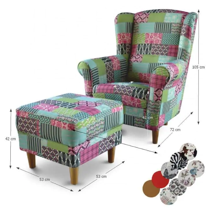 Provedení: Oblíbený typ křesla "ušák" je dodáván včetně taburetu pro maximální pohodlí a relaxaci. Křeslo s taburetem je vyrobeno v potahové látce Patchwork M1 v kombinaci dřevěných nožiček v barvě buk. Rozměry (ŠxVxH) křeslo - 86x105x72 cm, výška x hloubka sezení 42x48 cm taburet - 53x42x53 cm