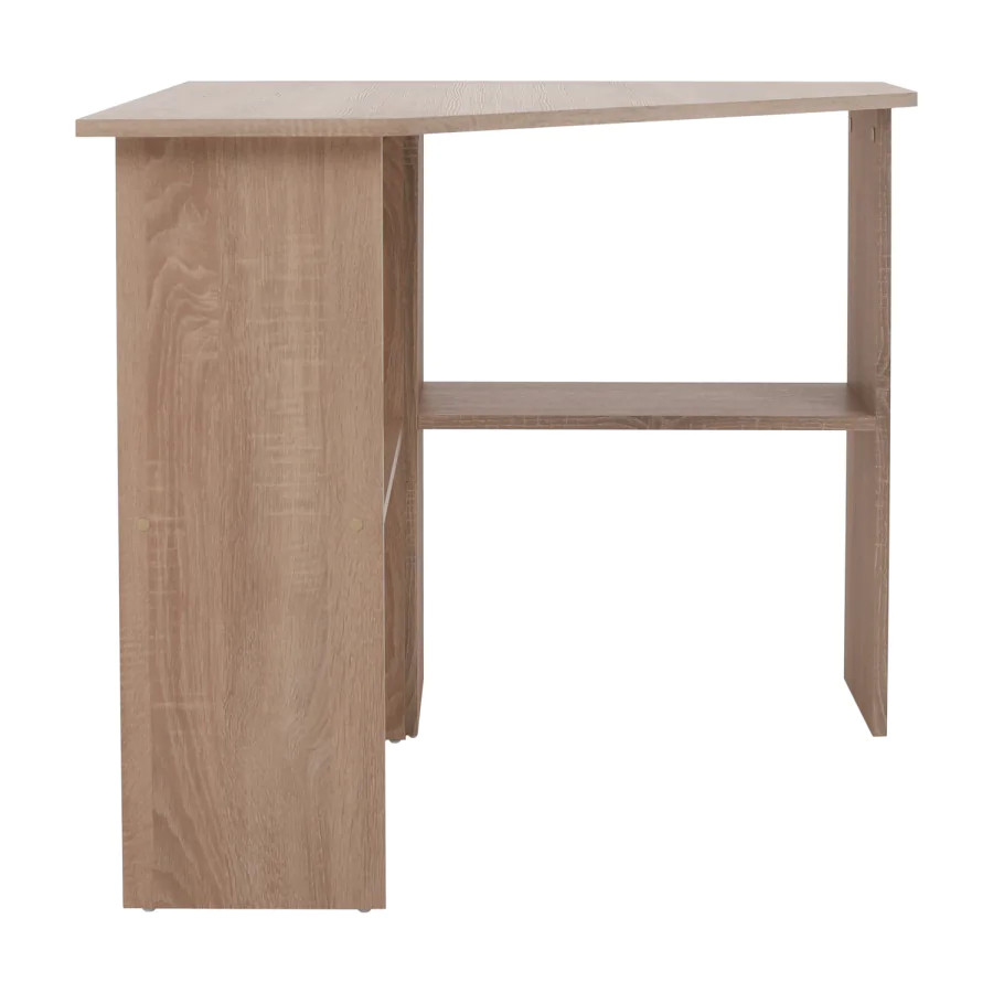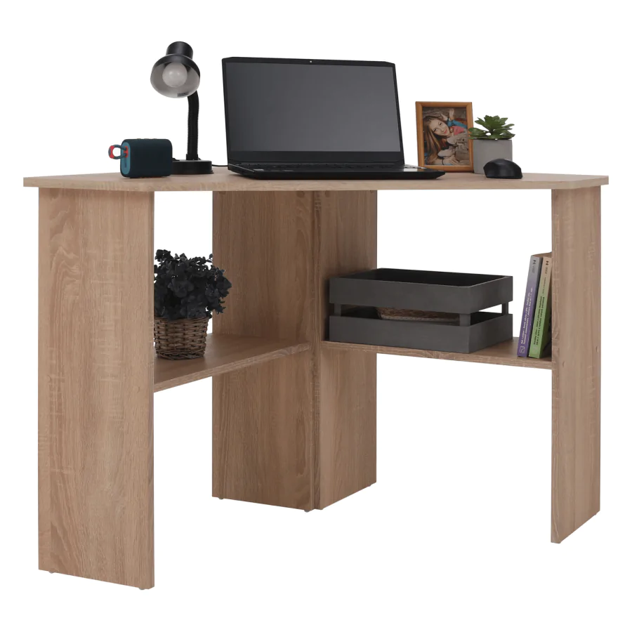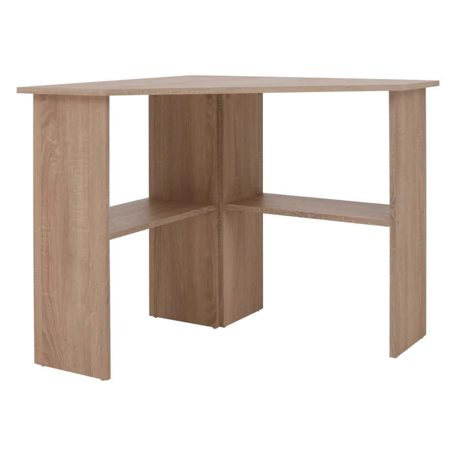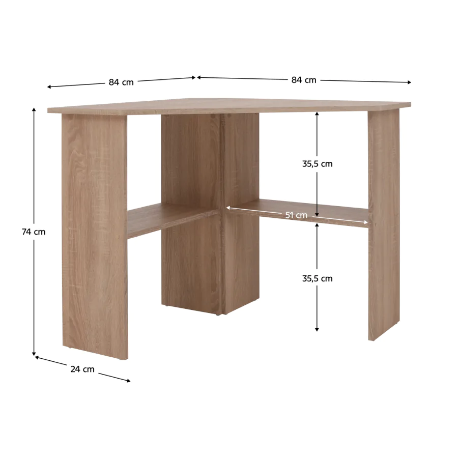 Provedení: Praktický rohový PC stůl je vyroben z laminované dřevotřísky v barevném provedení dub sonoma. Stolek je vhodný do pracoven, dětských pokojů apod. Obsahuje dvě odkládací police, které lze využit na tiskárnu či další příslušenství k PC. Dodáváno v demontu.