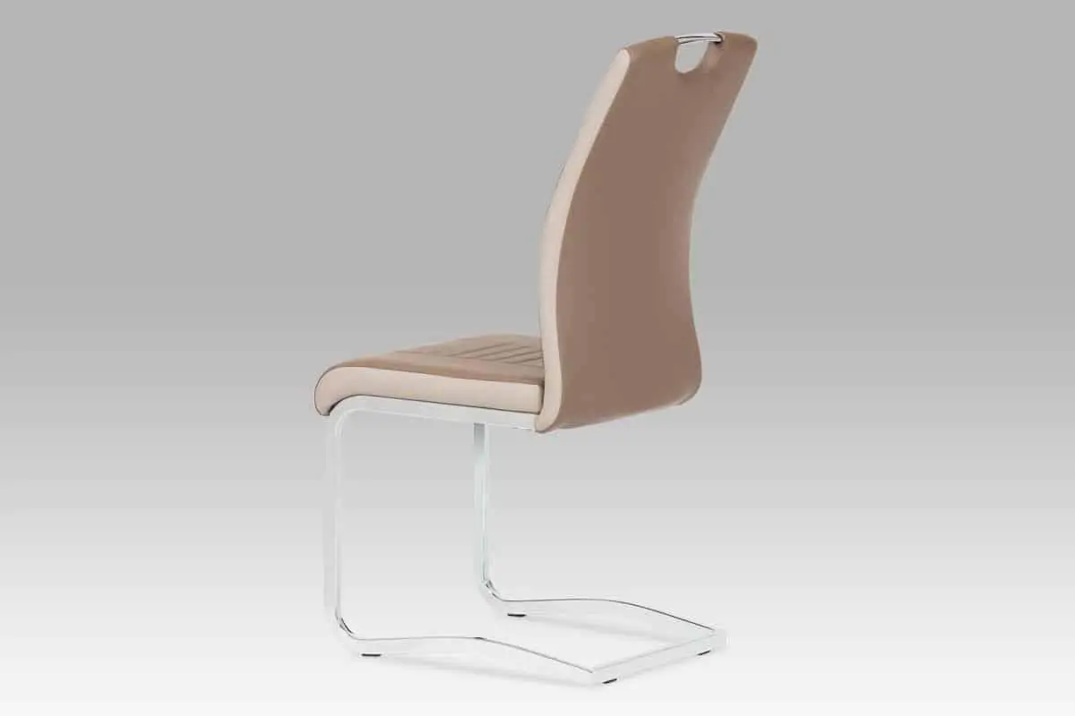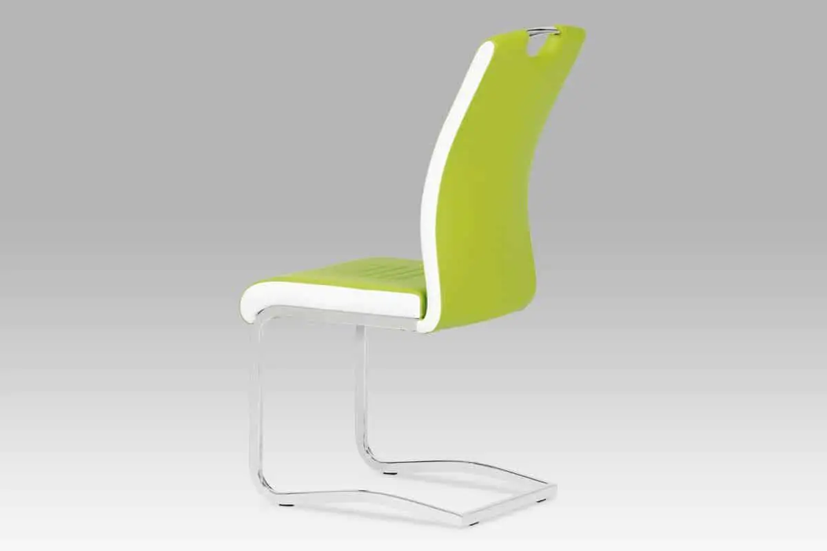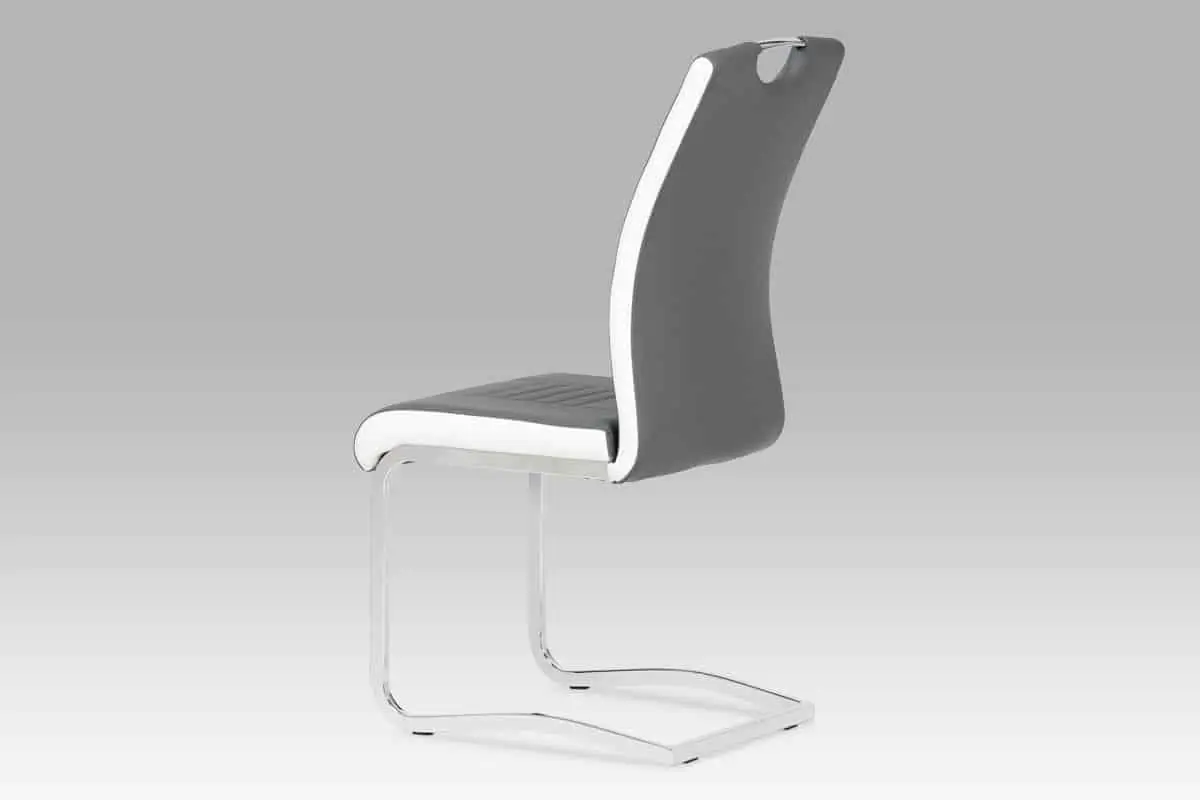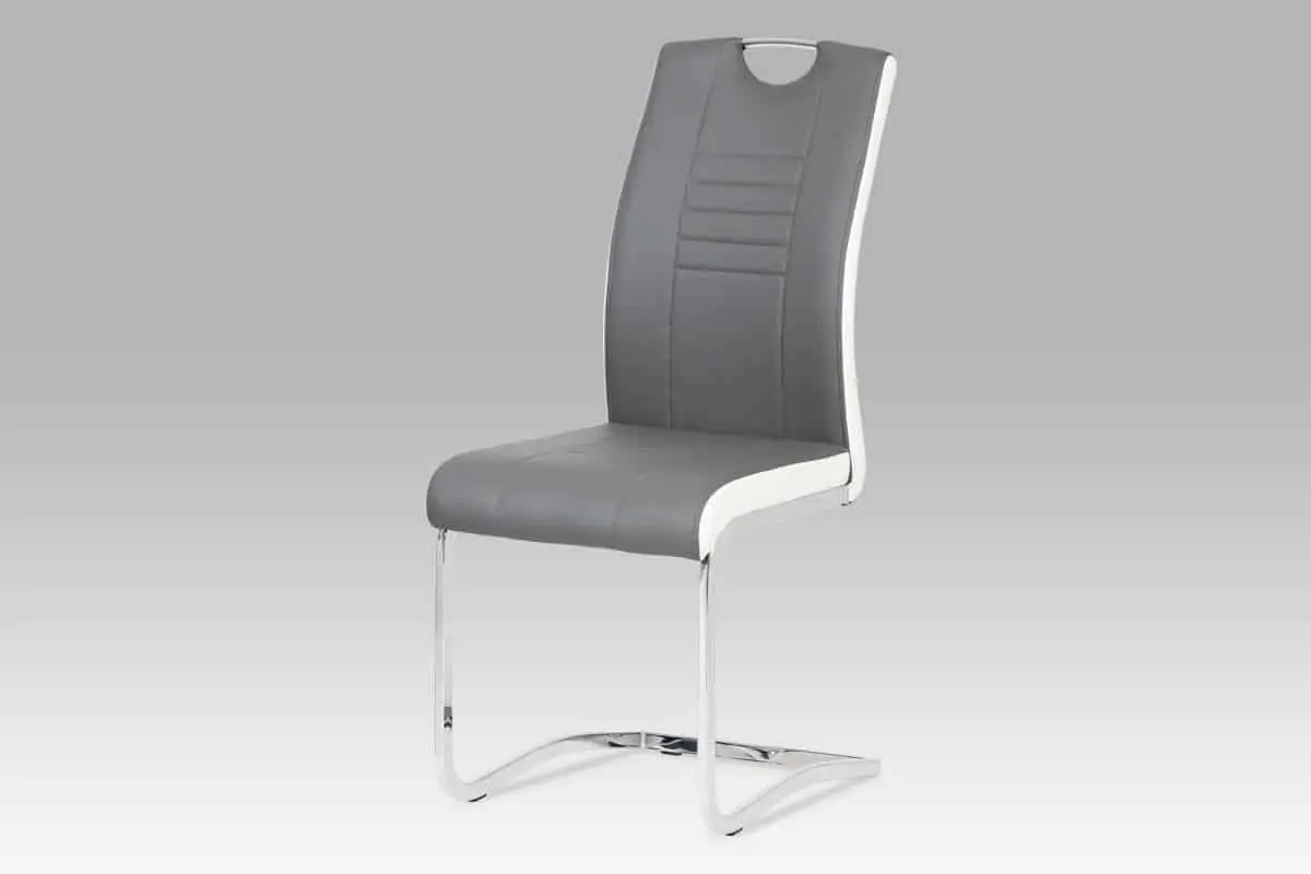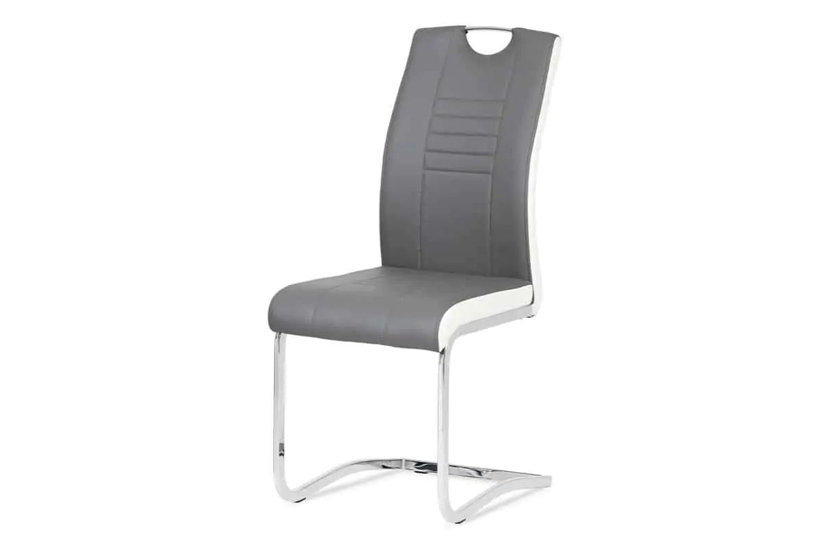 Provedení: Moderní jídelní židle na kovové chromové podnoži s čalouněným sedákem a opěrákem je opatřena kovovým madlem, který usnadňuje manipulaci se židlí. Židle je čalouněna koženkou, na výběr jsou 4 barevná provedení: koženka černá s bílými boky koženka šedá s bílými boky Jelikož židle jsou montované z několika komponentů, jejich určení je výhradně pro domácí interiéry a nejsou tudíž vhodné do společenských prostor.