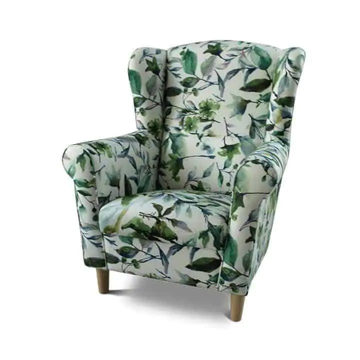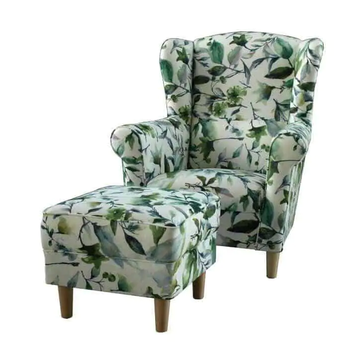 Provedení: Oblíbený typ křesla "ušák" je dodáván včetně taburetu pro maximální pohodlí a relaxaci. Křeslo s taburetem je vyrobeno v potahové látce vzor listí v kombinaci dřevěných nožiček v barvě buk. Rozměry (ŠxVxH) křeslo - 86x105x72 cm, výška x hloubka sezení 42x48 cm taburet - 53x42x53 cm