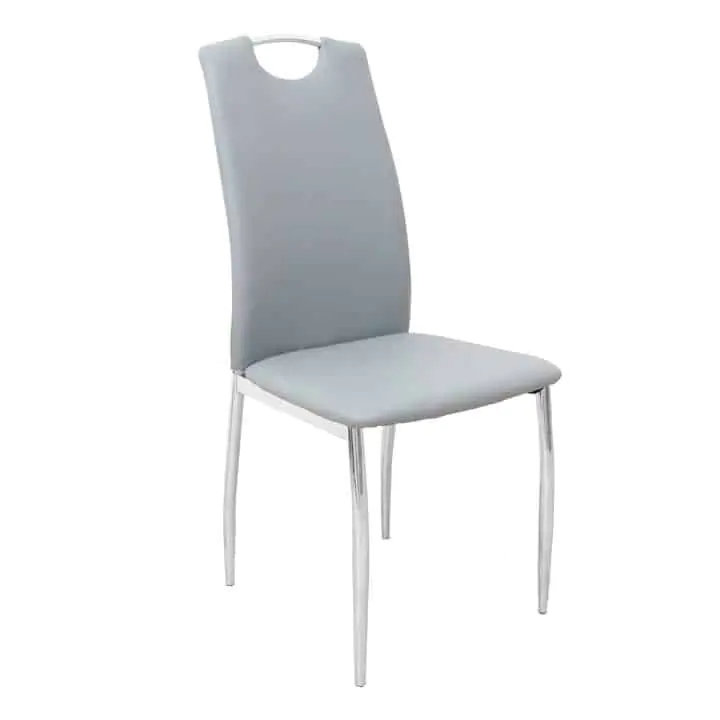 Moderní jídelní židle je velice elegantní díky jednoduchému tvaru. Nohy židle jsou kovové, chrom. Sedák a opěrák je čalouněný šedou ekokůží. Jídelní židle je dodávána v demontu. Nabízíme možnost smontování. Jelikož jsou židle montované z několika komponentů, jejich určení je výhradně pro domácí interiéry a nejsou tudíž vhodné do společenských prostor.
