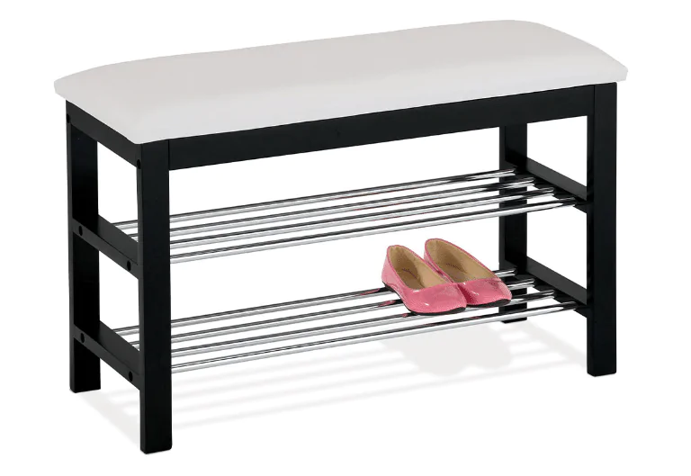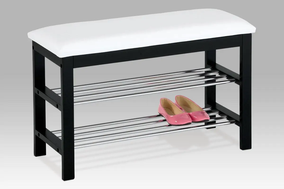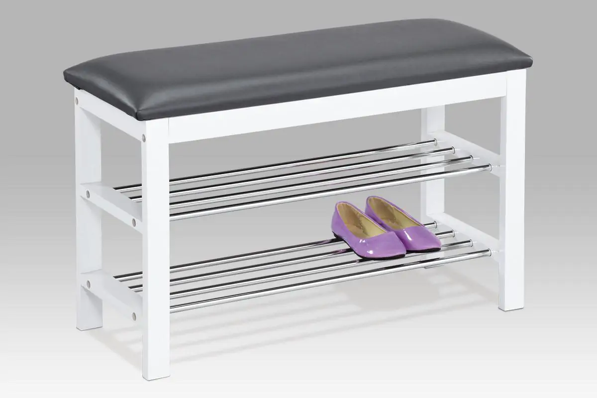 Praktický botník s čalouněným koženkovým sedákem je dodáván ve třech barevných provedeních: WT - bílá barva se sedákem v šedé kožence BK - černá barva se sedákem v bílé kožence WAL - barva ořech se sedákem v hnědé kožence Konstrukce je v kombinaci dřeva a chromu. Tloušťka chromových trubek je 12 mm. Nosnost sedáku je 90 kg. Botník v předsíni využijete nejen na odkládání bot, ale i jako lavici. Dodáváno v demontu.