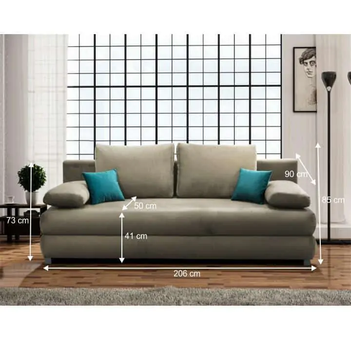 Pohovka s úložným prostorem a rozkladem na spaní nabízí plochu na spaní v rozměru 150x200 cm. Je vyrobena v kombinaci potahové látky Aria 15 šedá / tyrkysová. Výška x hloubka sezení: 41x50 / 76 cm Výška zádové opěrky: 32 cm. Dodávané v demontu.