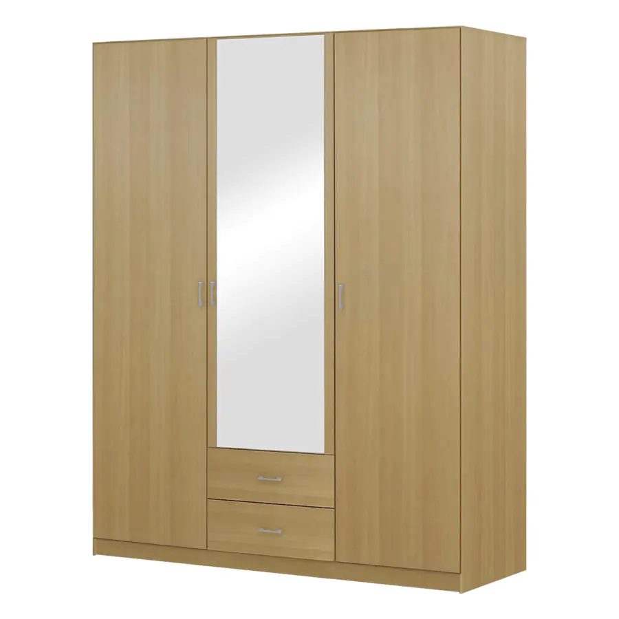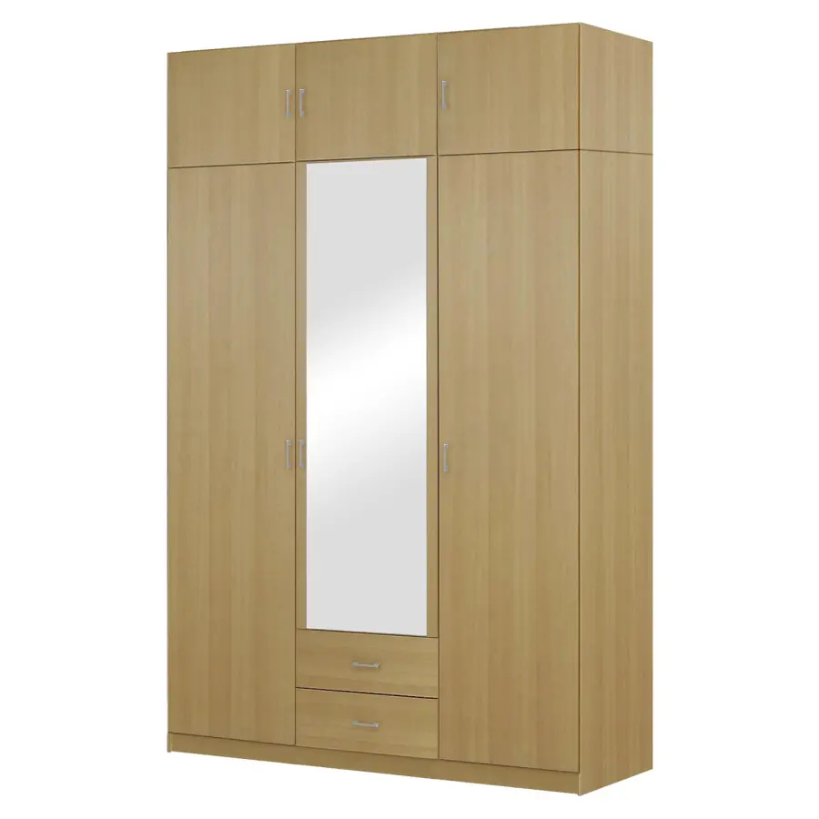 Třídveřová šatní skříň se zrcadlem je vyrobena z laminované dřevotřísky v barevném provedení buk. Obsahuje 1 zrcadlové a 2 plné dveře, 2 malé zásuvky. Nástavec není součástí skříně. Nástavec 11535 lze dokoupit zvlášť. KARTON: 3 ks (rozměry, š/v/d: 51 x 7 x 138 cm, 52 x 6 x 196 cm, 47 x 7 x 188 cm) Dodáváno v demontu.