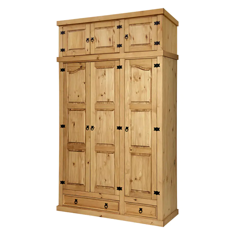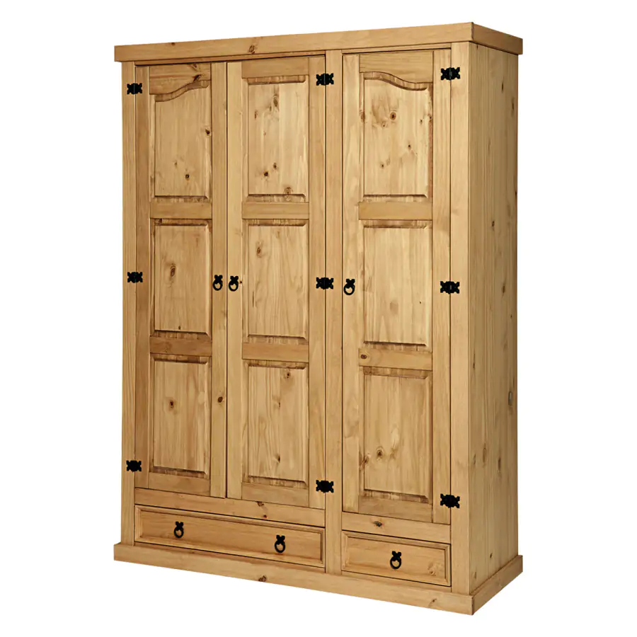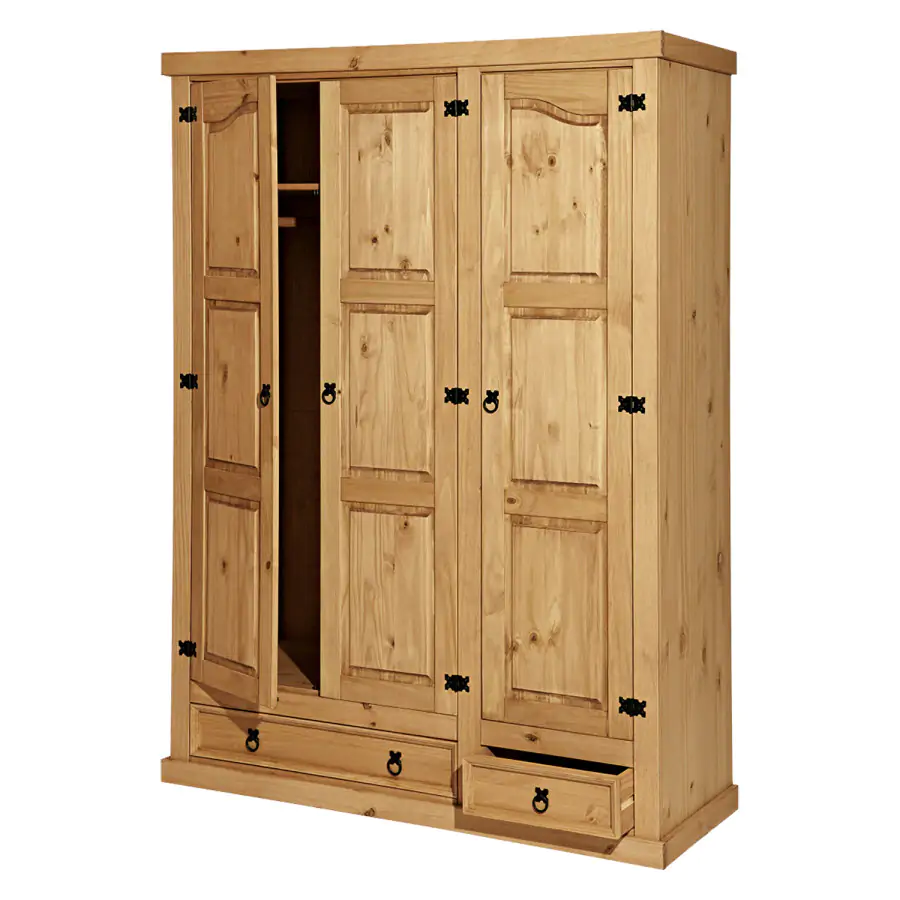Šatní skříň je vyrobena z borovice masiv. Je voskovaná v medovém odstínu. Prostor skříně je dělený v poměru 2:1 širší část šatní tyč a police na klobouky, užší část 3 police ve spodní části 1 velká a 1 malá zásuvka, kovové ozdobné úchytky. Dodáváno v demontu.