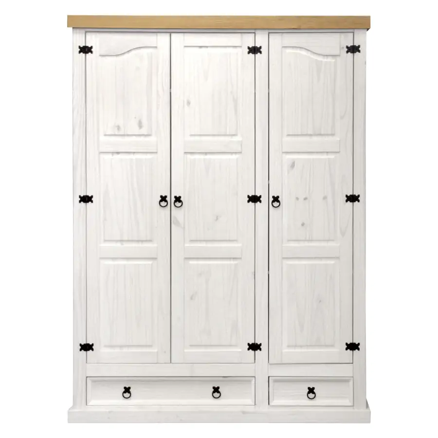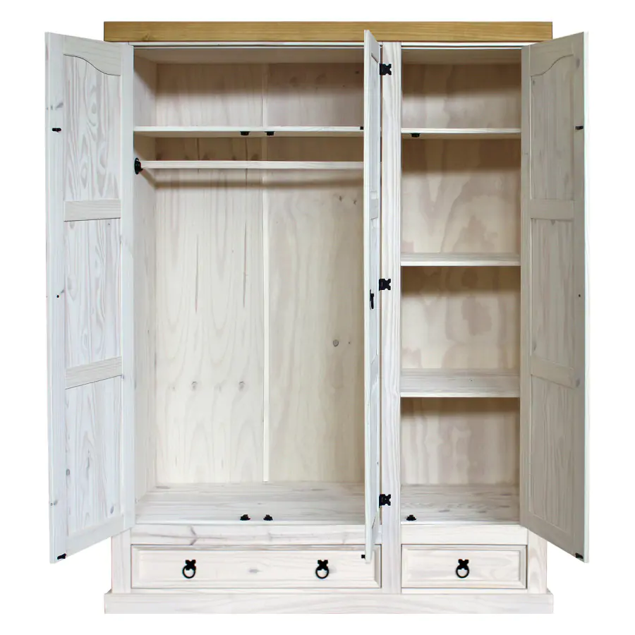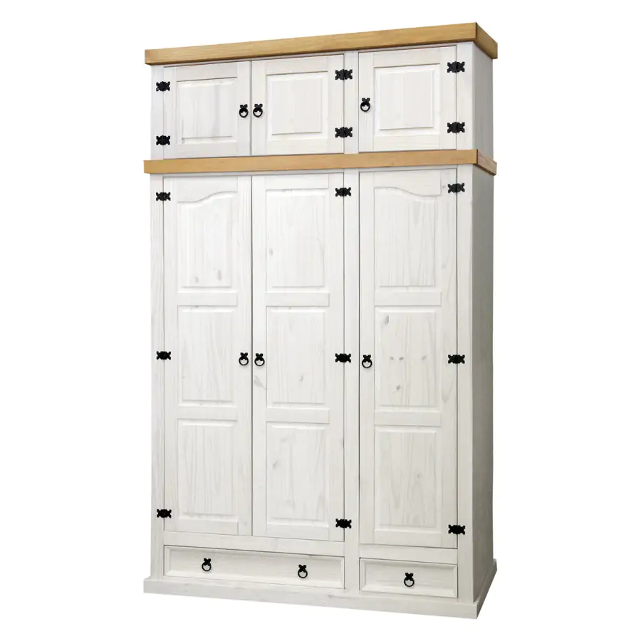 Skříň z masivní borovice, voskovaná v bílém odstínu, horní deska je masiv borovice voskovaná v medovém odstínu. Prostor je dělený v poměru 2:1, širší část má šatní tyč a police na klobouky, v užší části jsou 3 police. Spodní část obsahuje 1 velkou a 1 malou zásuvku. Šatní skříň má stylové kovové ozdobné úchytky. Dodáváno v demontu.