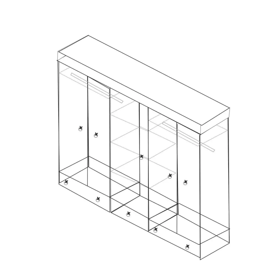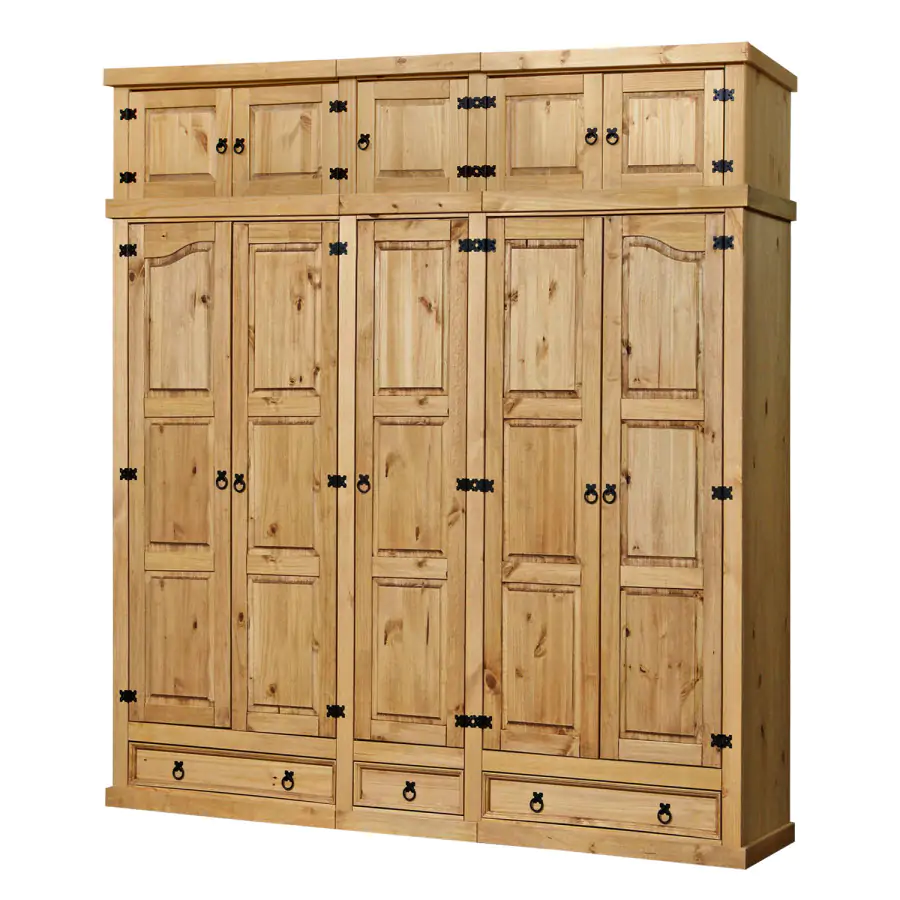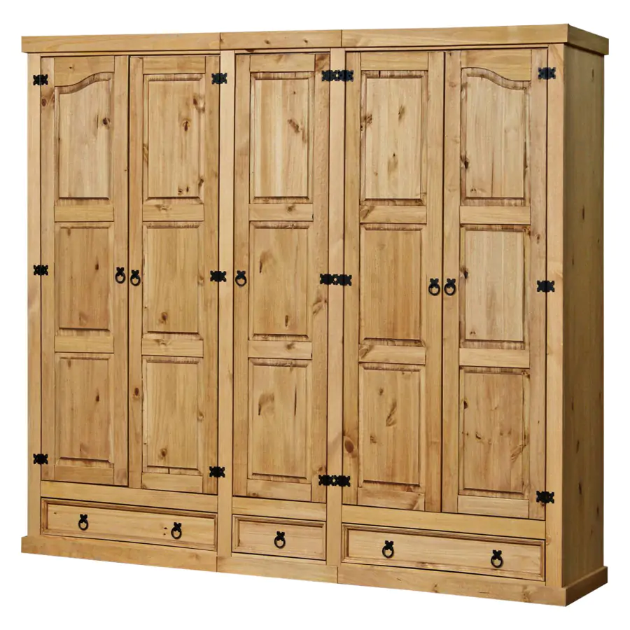 Šatní skříň z masivní borovice je voskovaná, v medovém odstínu. Prostor je dělený v poměru 2:1:2. V obou širších částech je šatní tyč a police na klobouky, střední užší část obsahuje 3 variabilní police. Ve spodní části jsou 2 velké a 1 malá zásuvka. Skříň má stylové kovové ozdobné úchytky. Dodáváno v demontu.