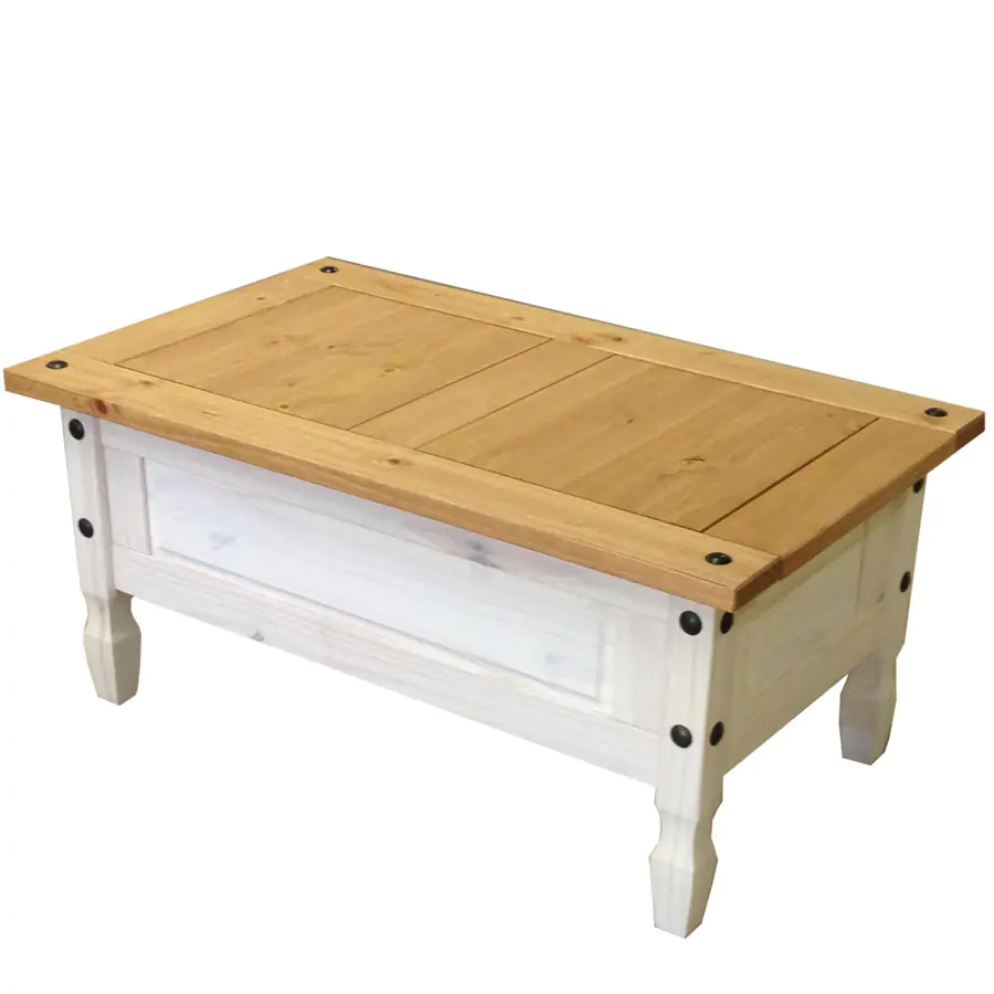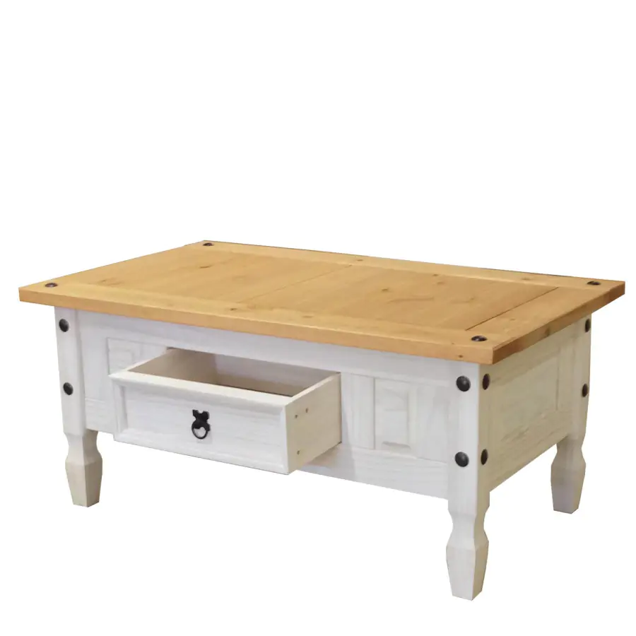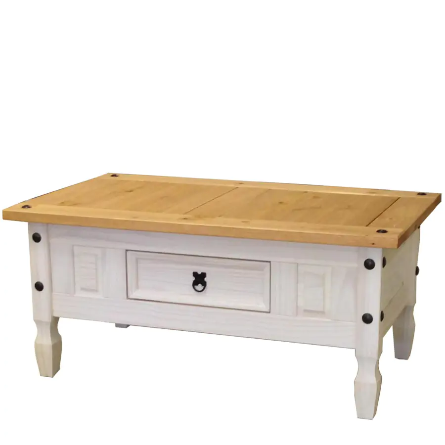 Stylový konferenční stolek je vyroben z masivní borovice, voskovaný v bílém odstínu, horní deska je voskovaná v medovém odstínu. Obsahuje 1 zásuvku s kovovými ozdobnými úchytky.