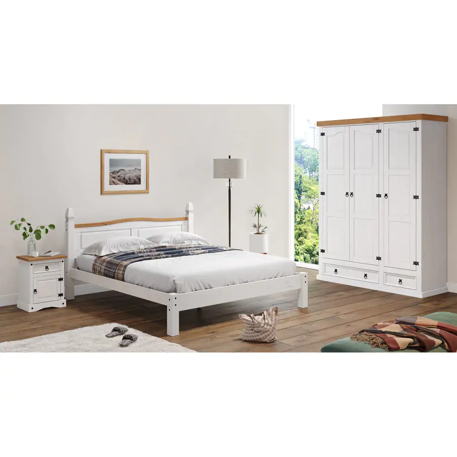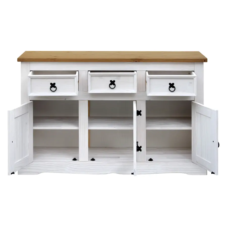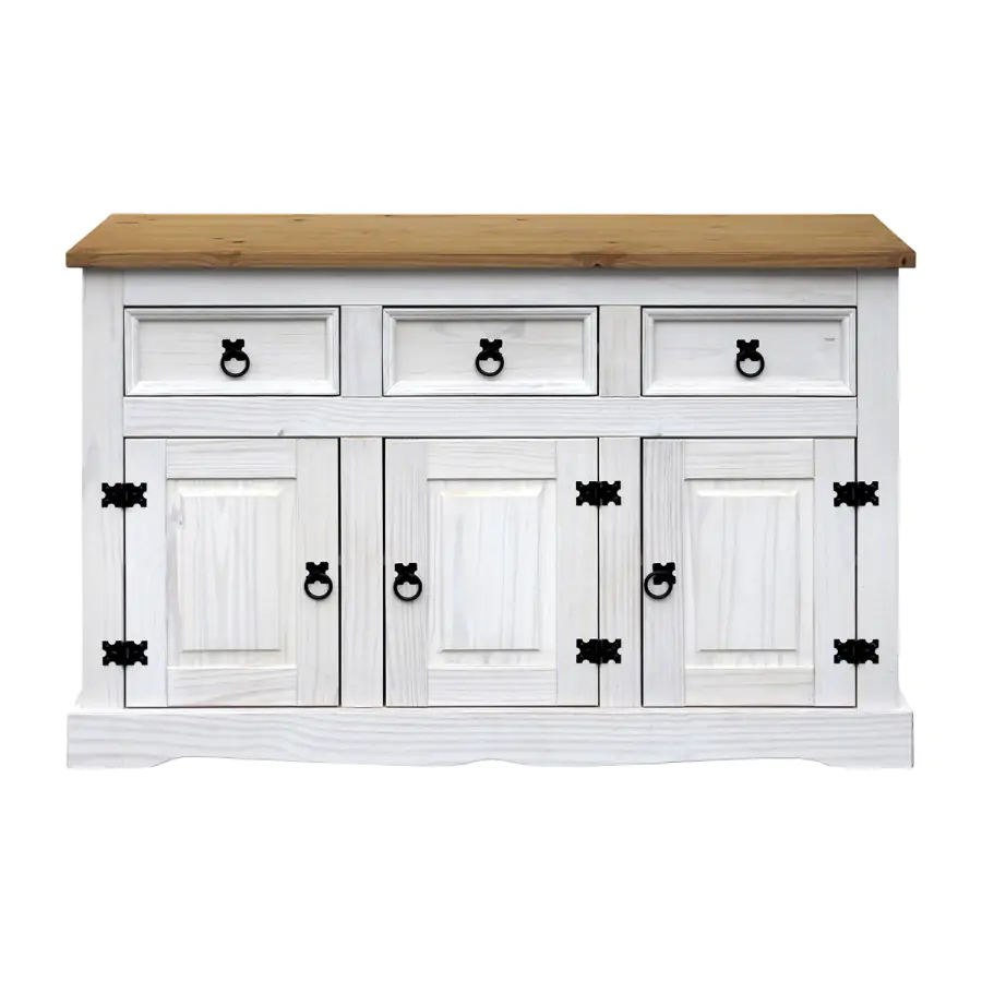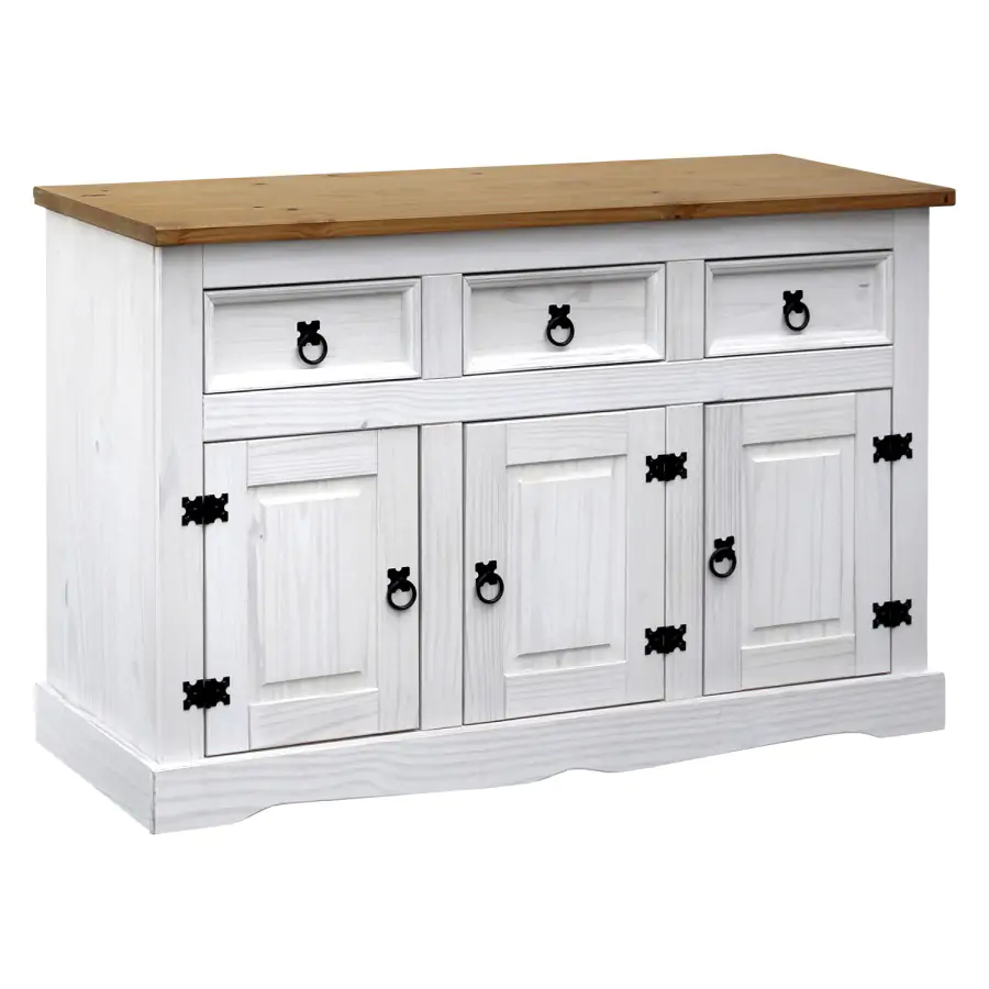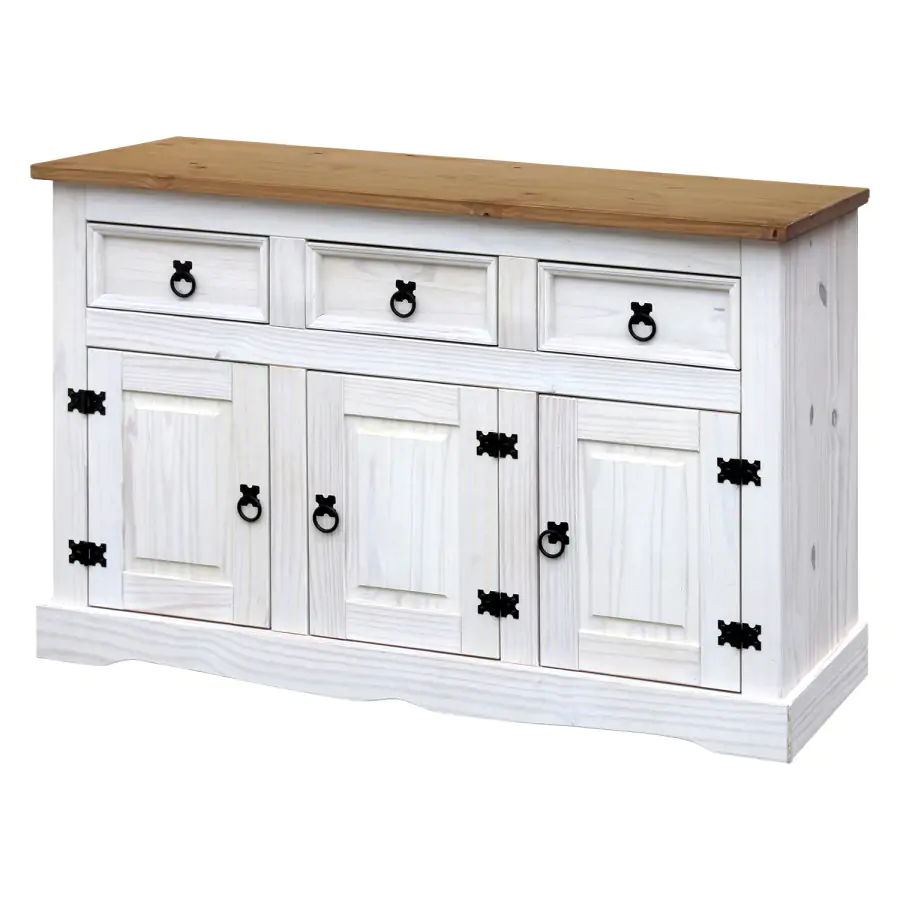 Stylová komoda je vyrobena z masivní borovice, voskovaná v bílém odstínu, horní deska je voskovaná v medovém odstínu. Komoda má 3 malé zásuvky a 3 dvířka. Komodu zdobí kovové úchytky. Dodáváno v demontu.