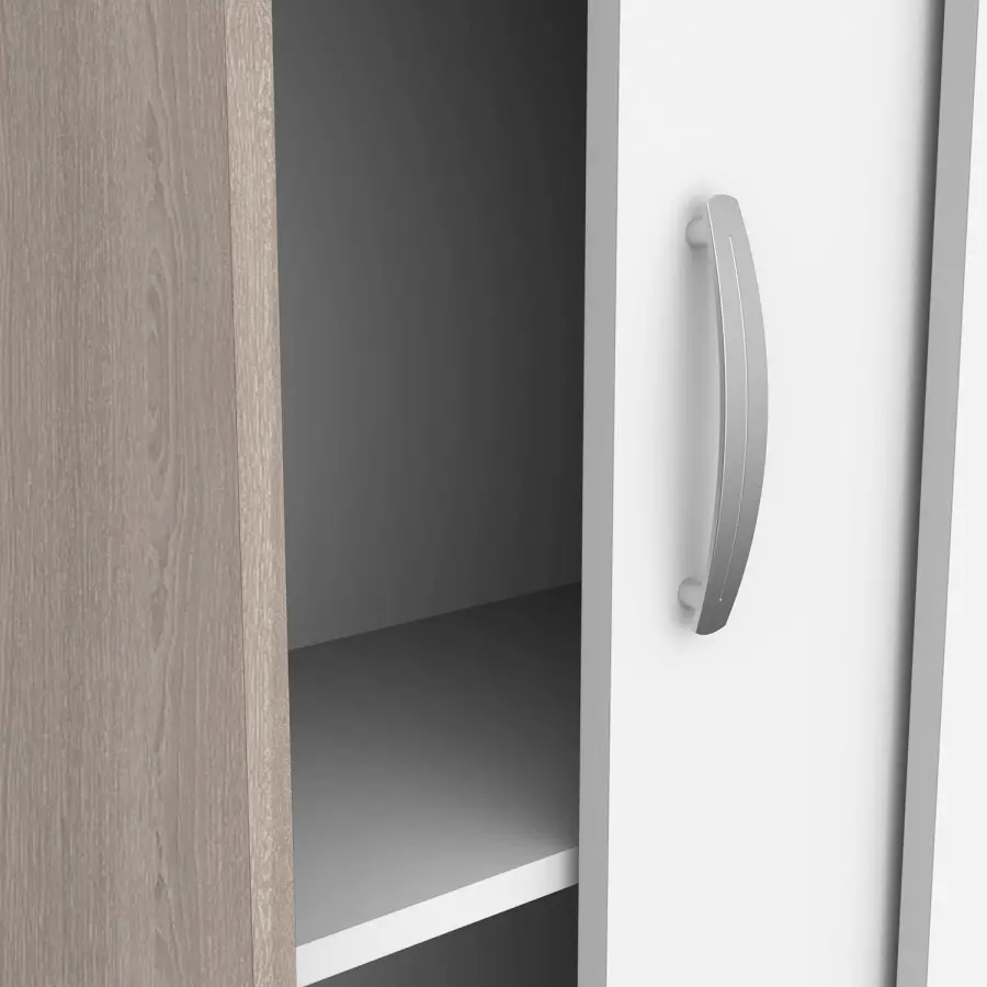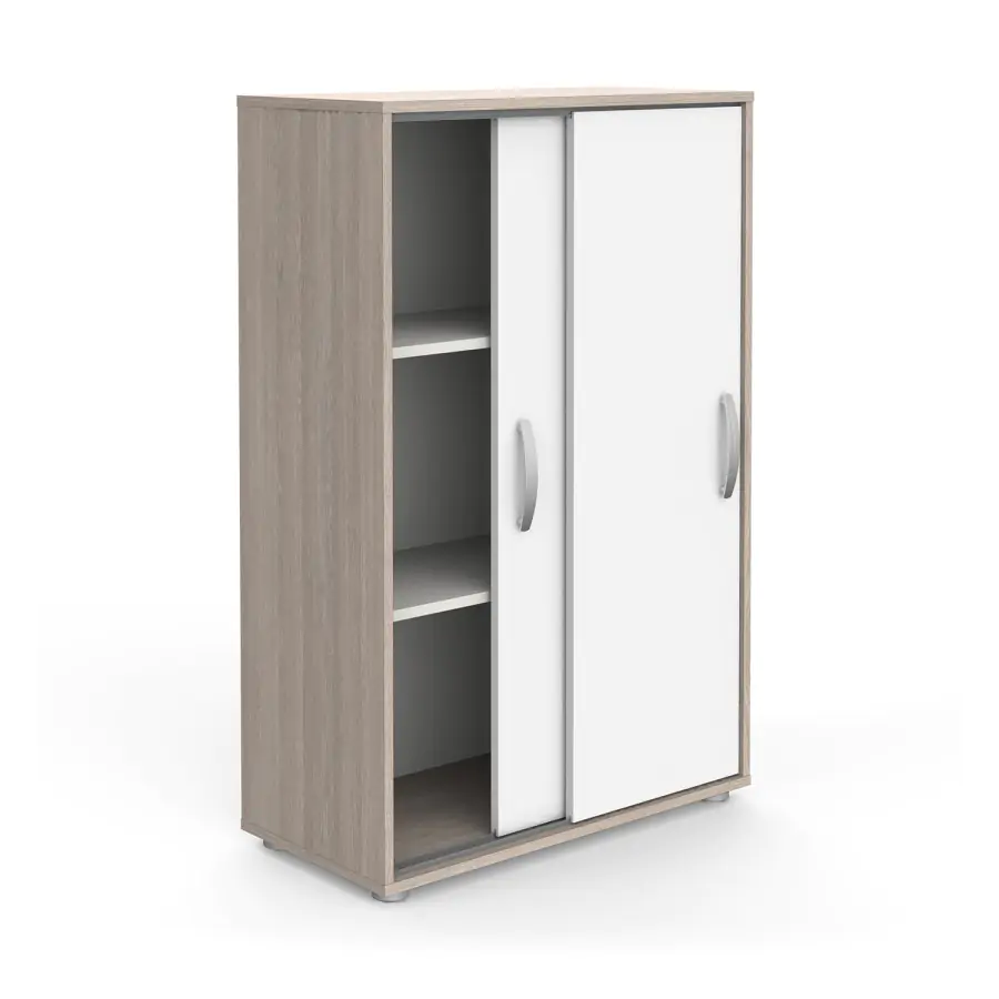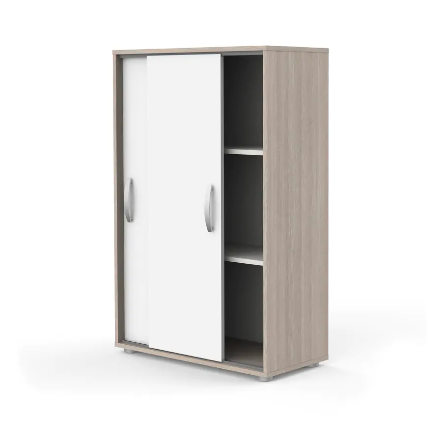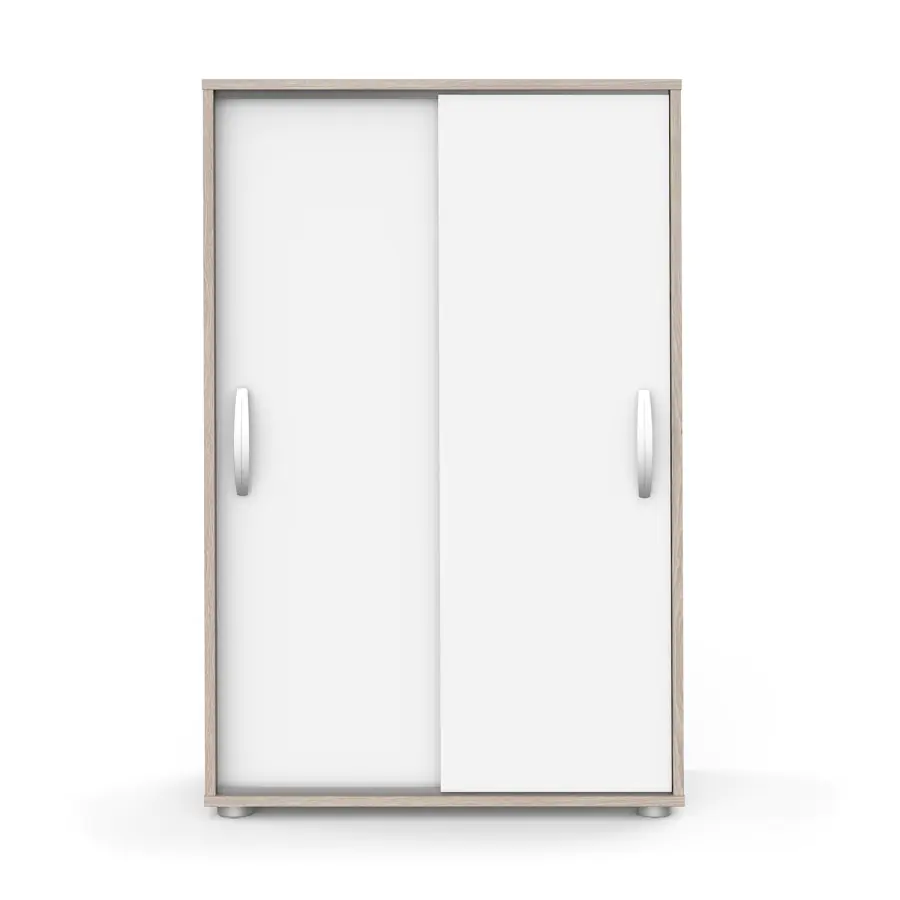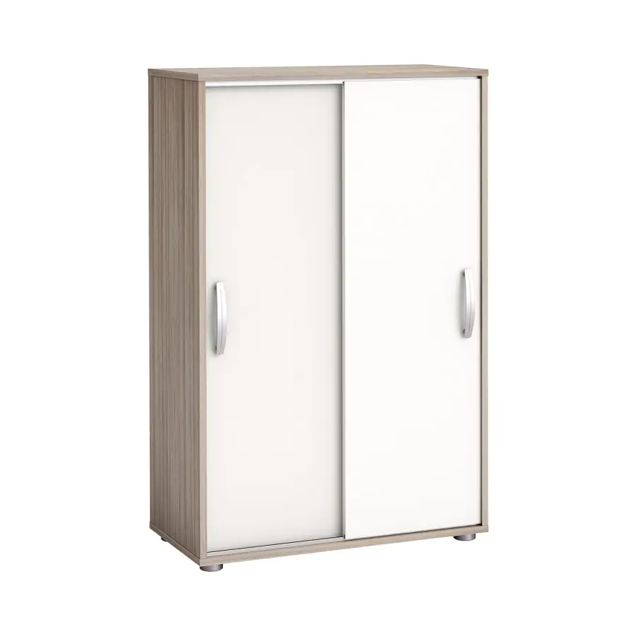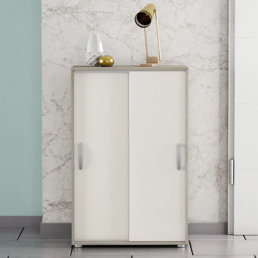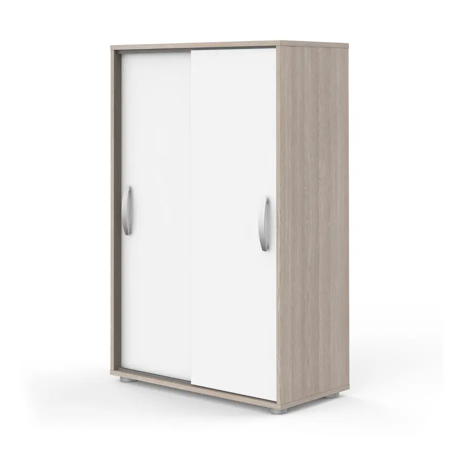 Komoda s posuvnými dveřmi je vyrobena z laminované dřevotřísky v barevném provedení dub Shannon / perleťově bílá. Obsahuje dvě variabilní police. Dodáváno v demontu.