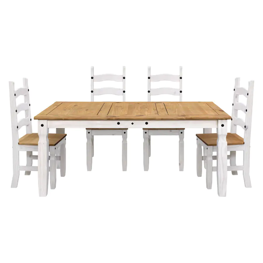 Provedení: Stylový jídelní set se skládá ze 4 židlí a pevného stolu obdélníkového tvaru. Obdélníkový stůl je vyroben z lakovaného masivního borovicového dřeva v přírodní barvě. Židle jsou zhotoveny z lakovaného masivního borovicového dřeva. Tento jídelní set najde své uplatnění nejen v každé kuchyni Rozměr stolu (š/h/v): 178 × 92 × 76 Rozměr židle (š/h/v): 41 × 46 × 85 cm