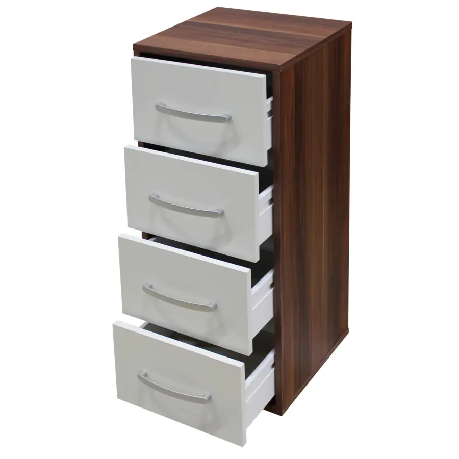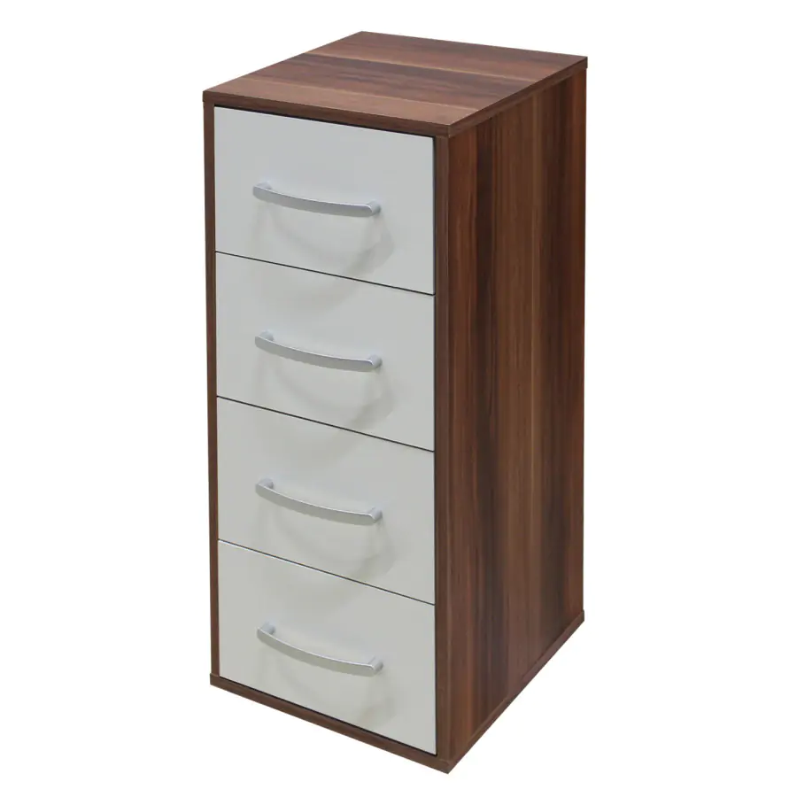 Provedení: Zásuvková komoda vyrobena z laminované dřevotřísky v barevném provedení ořech / bílá. Tato praktická komoda disponuje čtyřmi zásuvkami. Každá zásuvka je opatřena úchytkou. Hloubka zásuvky je 30 cm. Díky svému designu najde využití v mnoha ložnicích, obývacích pokojích, ale také v halách a předsíních. Komoda je dodávána v demontu.