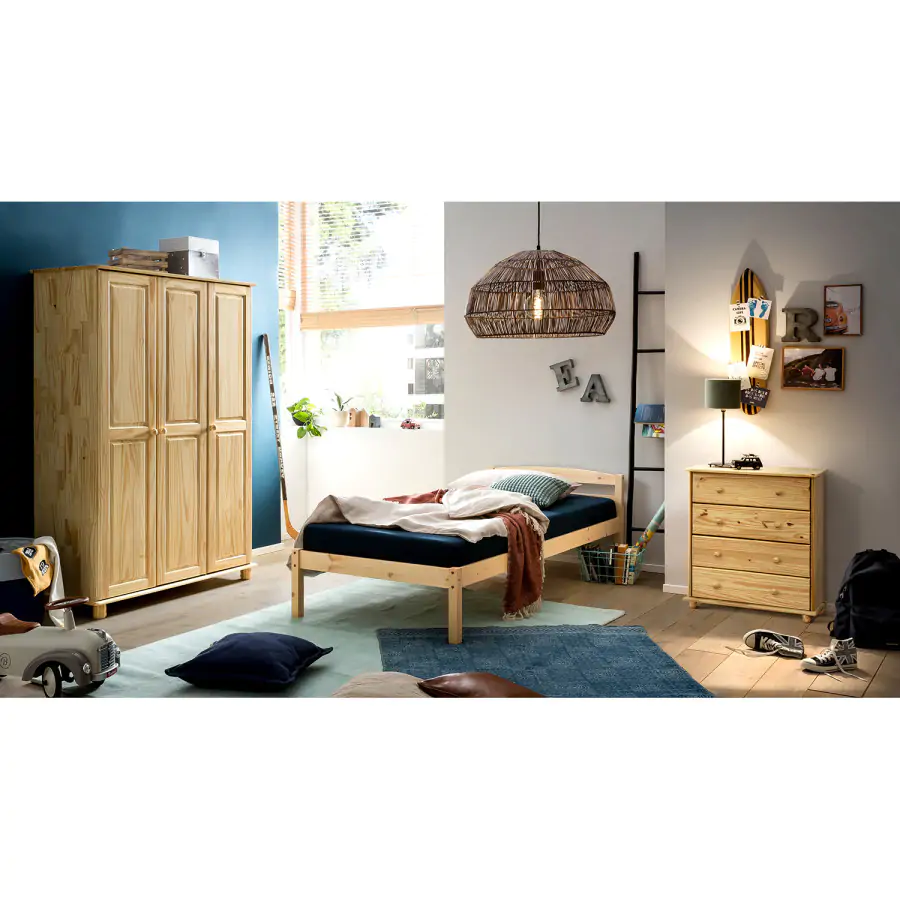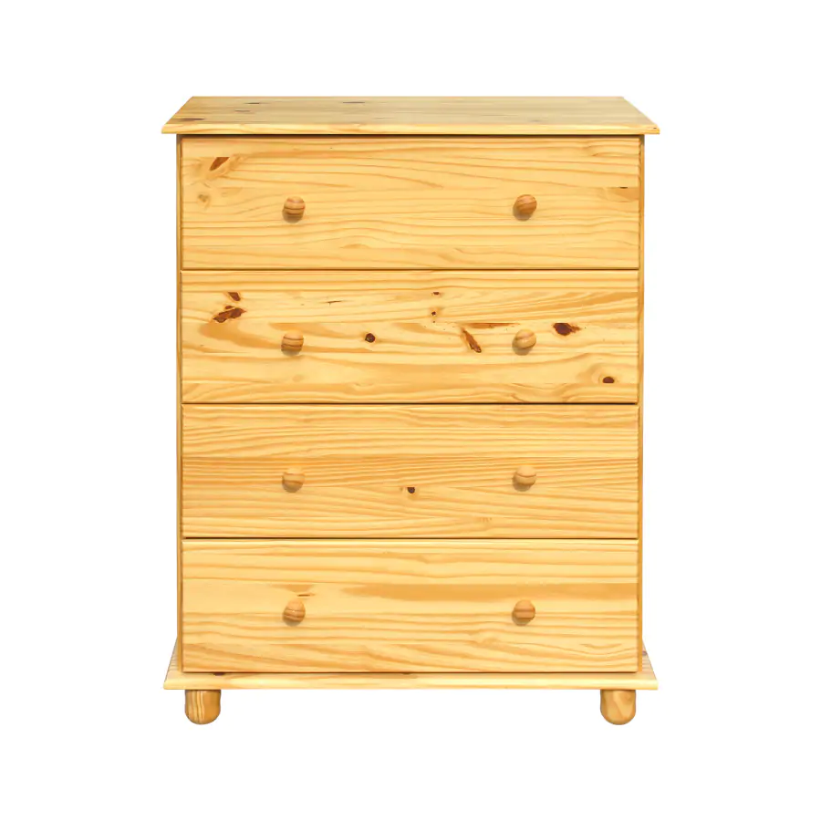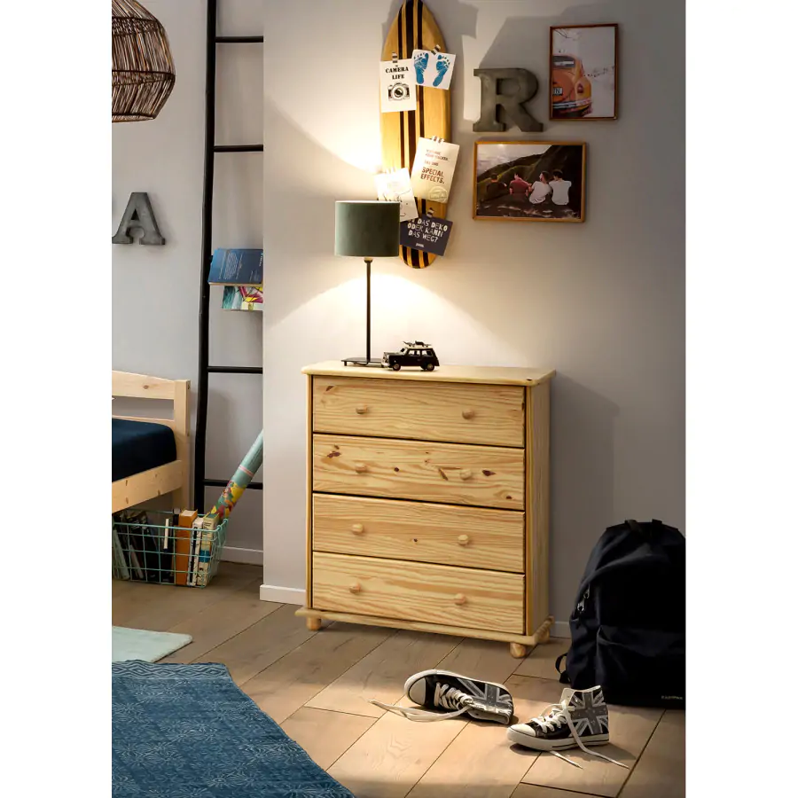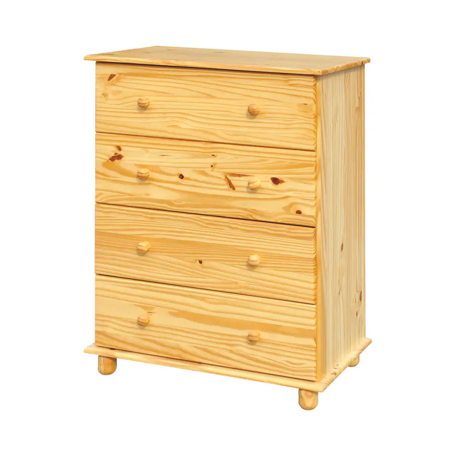 Provedení: Zásuvková komoda vyrobena z lakovaného masivního borovicového dřeva. Tato praktická komoda disponuje čtyřmi zásuvkami opatřenými kovovými pojezdy. Hloubka zásuvky je 33,5 cm. Díky svému designu najde využití v mnoha ložnicích, obývacích pokojích, ale také v halách a předsíních. Komoda je dodávána v demontu.