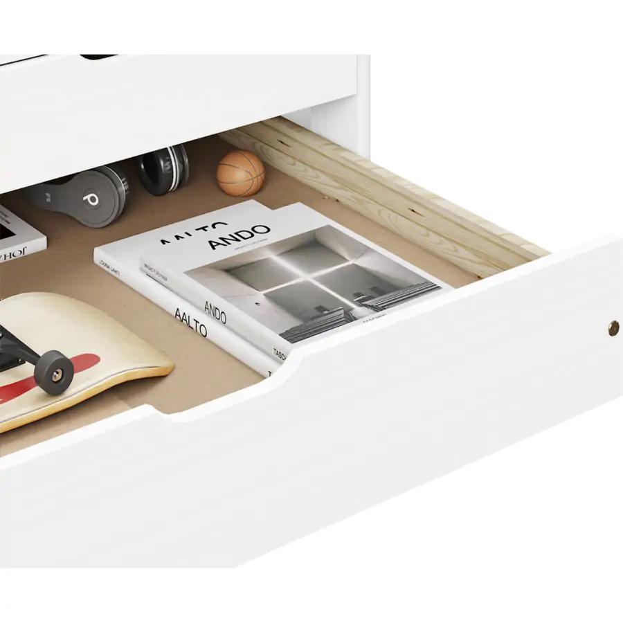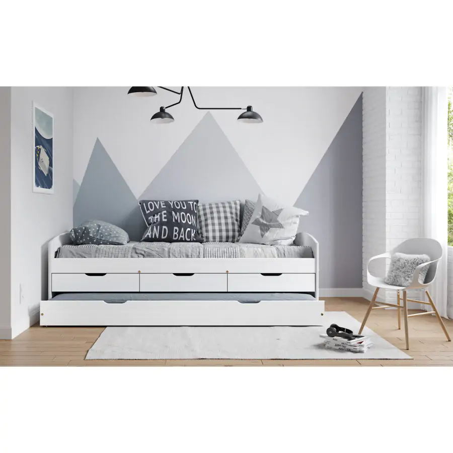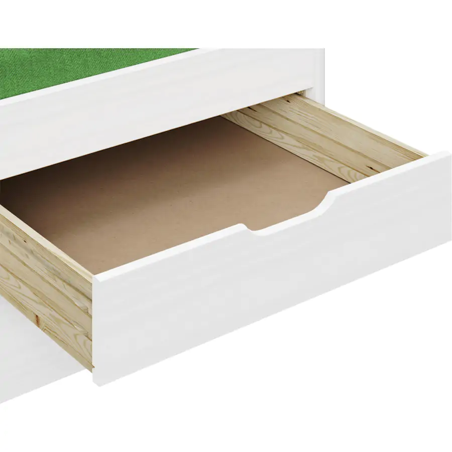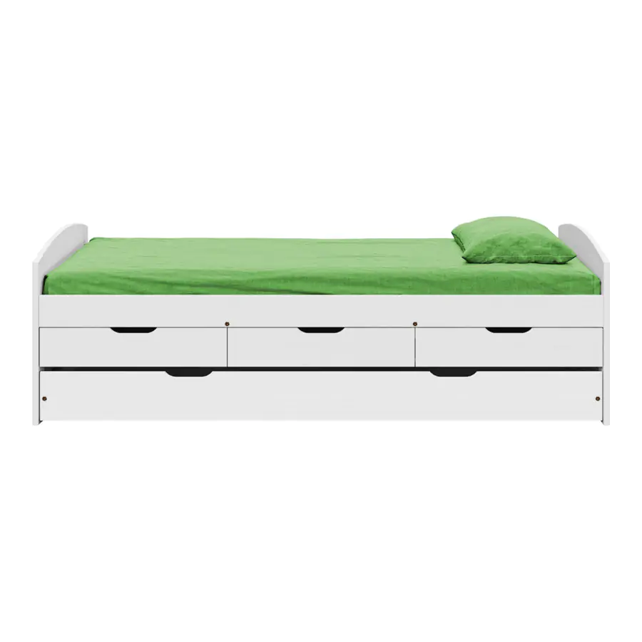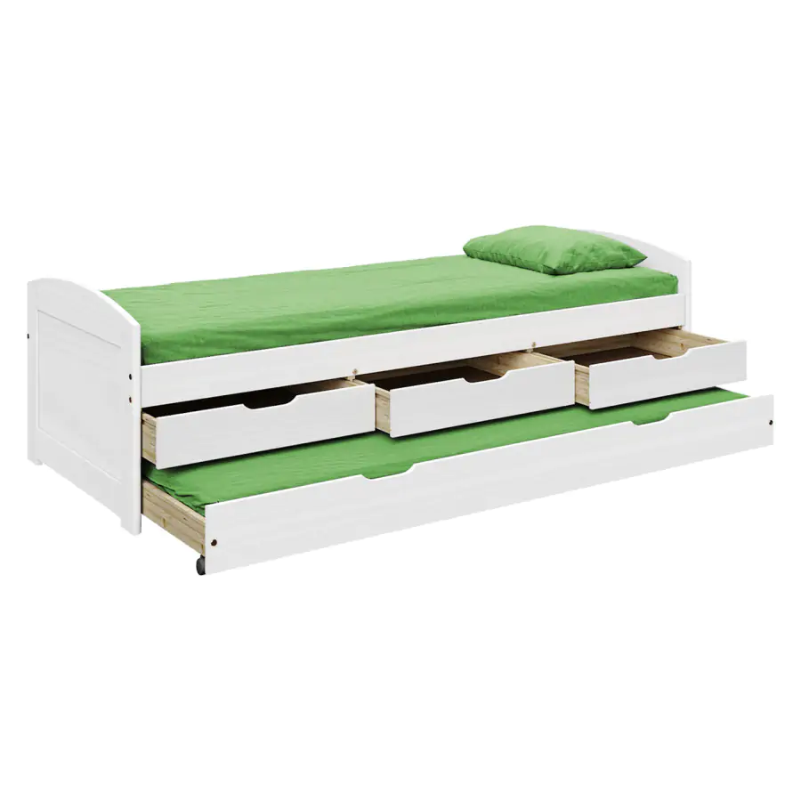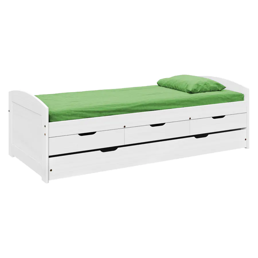 Jednolůžková postel z masivní borovice, barevné provedení bílý lak. Výška sedu 52 cm. Součástí postele jsou praktické úložné prostory pod postelí (3 zásuvky a výsuv) a dřevěný laťkový rošt. Výsuv je možné po doplnění o rošt užívat také jako přistýlku (rošt nutno doobjednat zvlášť, doporučená výška matrace do 10 cm). Matrace není v ceně postele, matraci v rozměru 90x200 cm je nutné dokoupit zvlášť. Dodáváno v demontu.