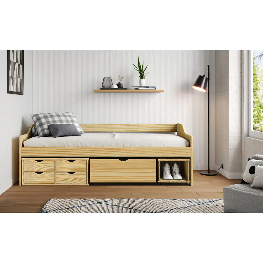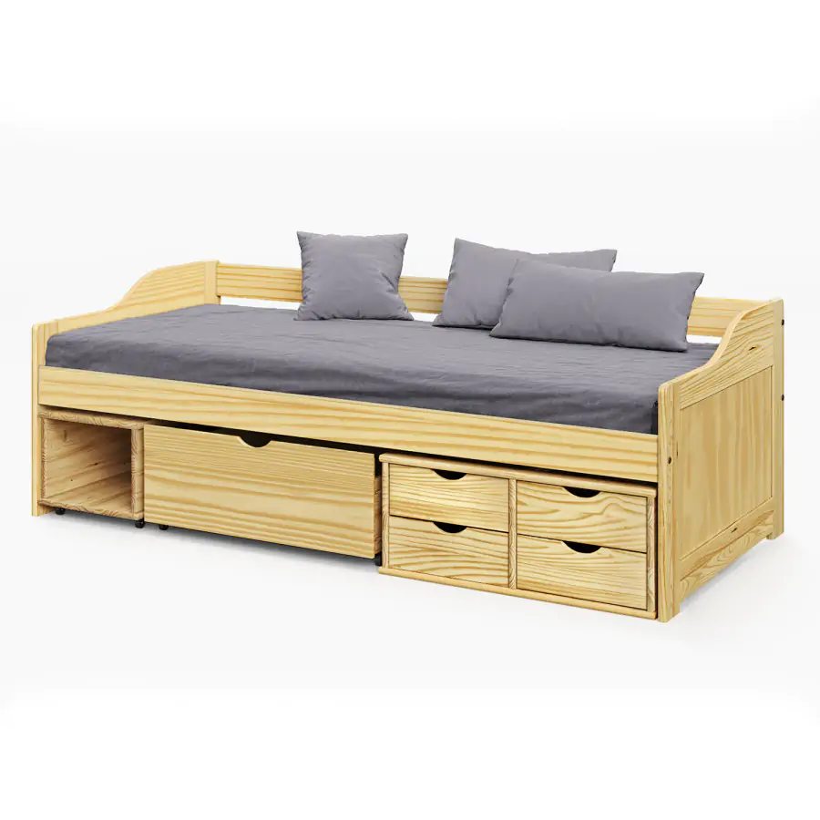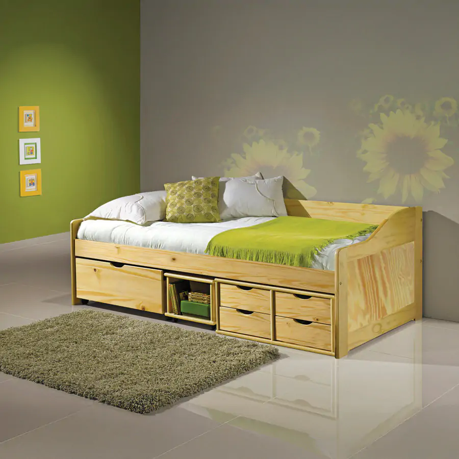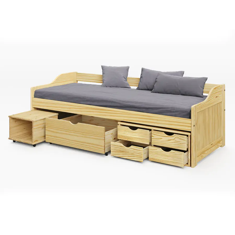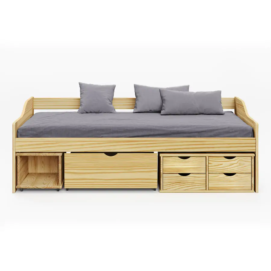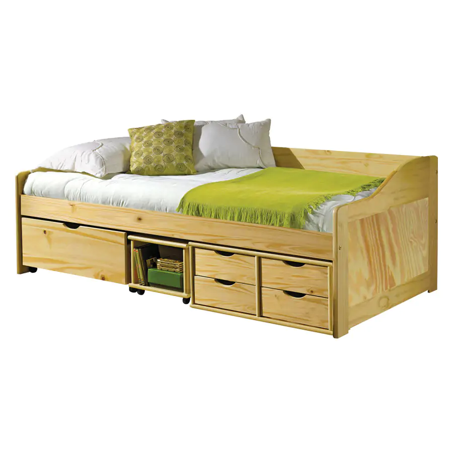 Jednolůžková postel je vyrobena z masivní borovice, lakované provedení. Obsahuje praktické úložné prostory pod postelí, hloubka zásuvek 39 cm. Výška sedu 50 cm. Postel je dodávána včetně roštu (dřevěný laťkový). Matrace není v ceně postele, lze ji dokoupit zvlášť. Doporučený rozměr matrace 90 × 200 cm. Jako vhodný doplněk doporučujeme čalouněný válec M10. hloubka široké zásuvky 65,5 cm hloubka malých zásuvek 39 cm Dodáváno v demontu.