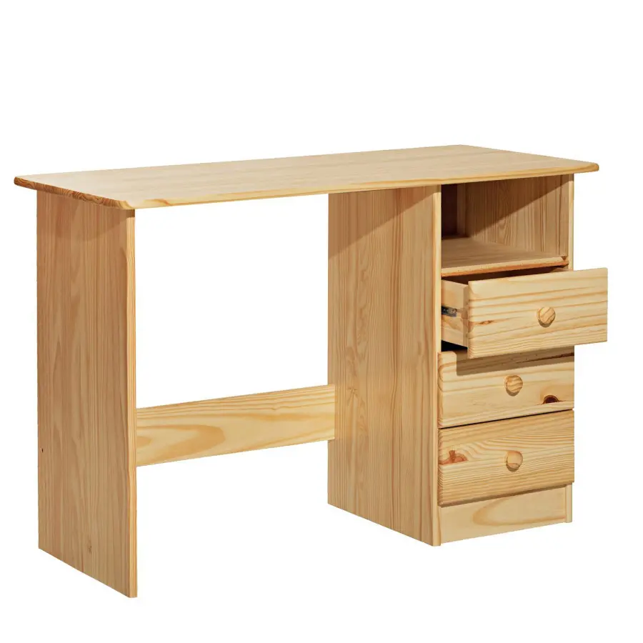 Psací stůl z masivní masiv borovice je vyroben v lakovaném provedení. Obsahuje 3 zásuvky s kovovými pojezdy (montáž možná pouze na pravou stranu). Dodáváno v demontu.