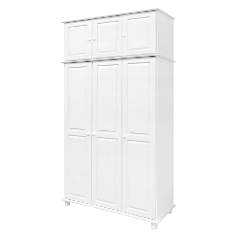 Dvoudveřová šatní skříň zhotovená z masivní borovice, barevné provedení bílý lak. Prostor je dělený v poměru 2:1, širší část obsahuje šatní tyč a police, užší část 3 variabilní police. Doporučujeme dokoupit nástavec 8864B, který není součástí skříně. Dodáváno v demontu.