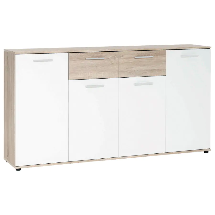 Provedení:Komoda Jacky 3 vás zaujme především svým moderním designem. Je vyrobena z laminované dřevotřísky. Korpus je vyroben v barevném provedení dub sonoma/bílá. Velmi prostorná komoda má dvě zásuvky s kovovými pojezdy a čtyři dvířka, za nimiž se nacházejí čtyři variabilní police. Zboží je dodáváno v demontu.