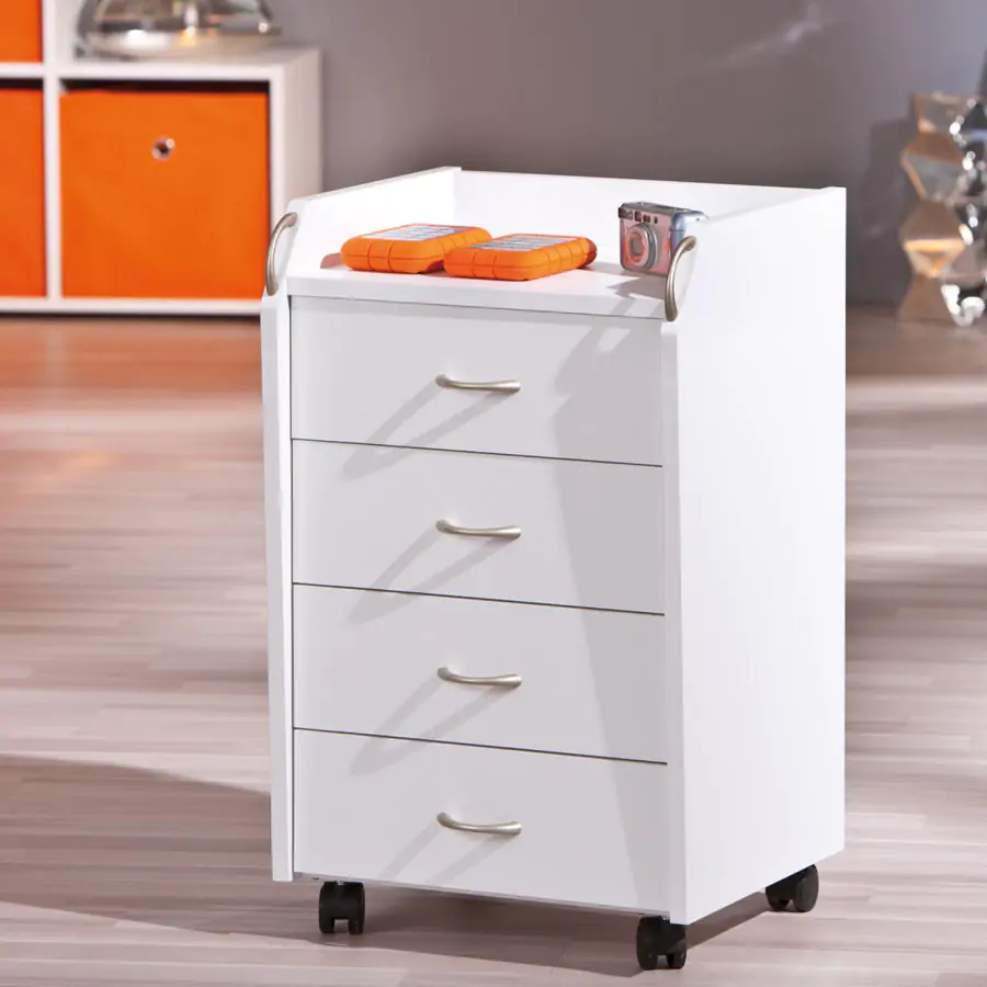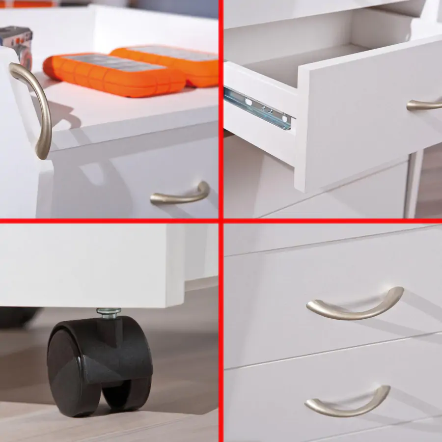 Provedení: Praktický kontejner je určen nejen k psacímu stolu, ale lze využít taktéž jako odkládací stolek. Je vyroben z laminované dřevotřísky v bílé barvě. Tento kontejner disponuje čtyřmi praktickými zásuvkami s kovovými pojezdy a díky kolečkům jej snadno přemístíte dle potřeby. Kontejner se hodí do každé kanceláře, pracovny či dětského pokoje. Zboží je dodáváno v demontu.