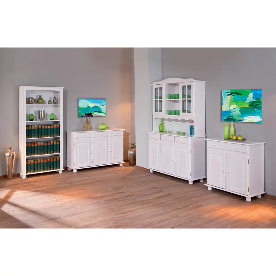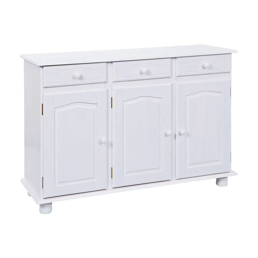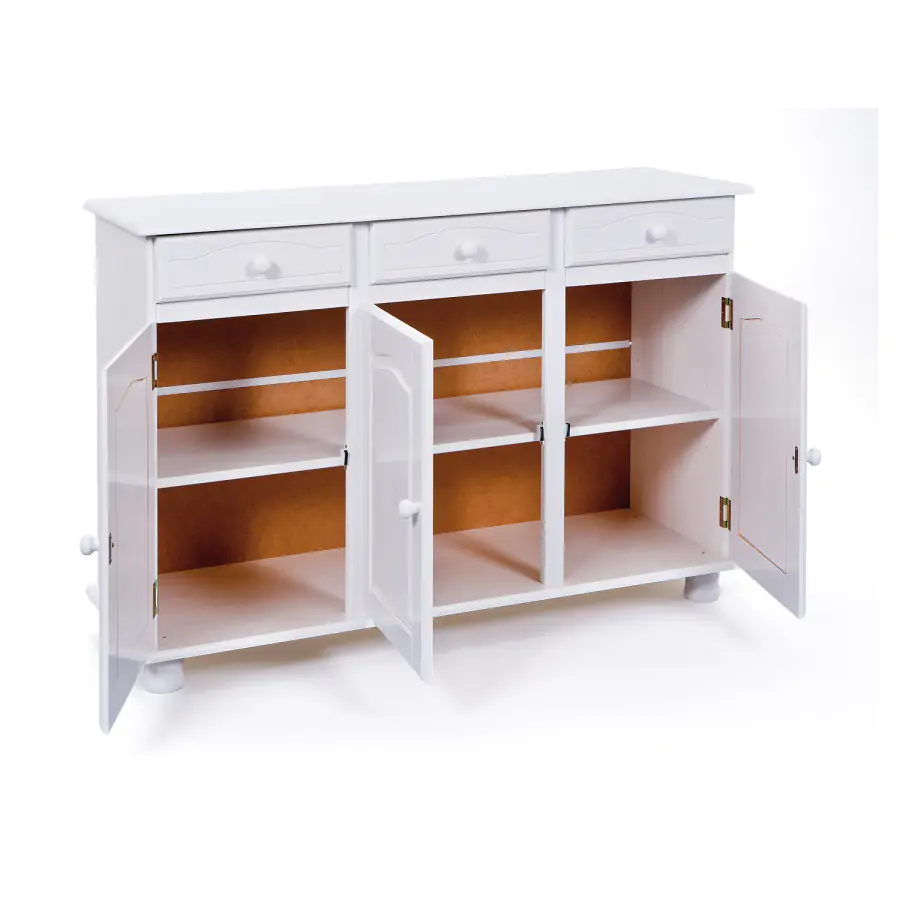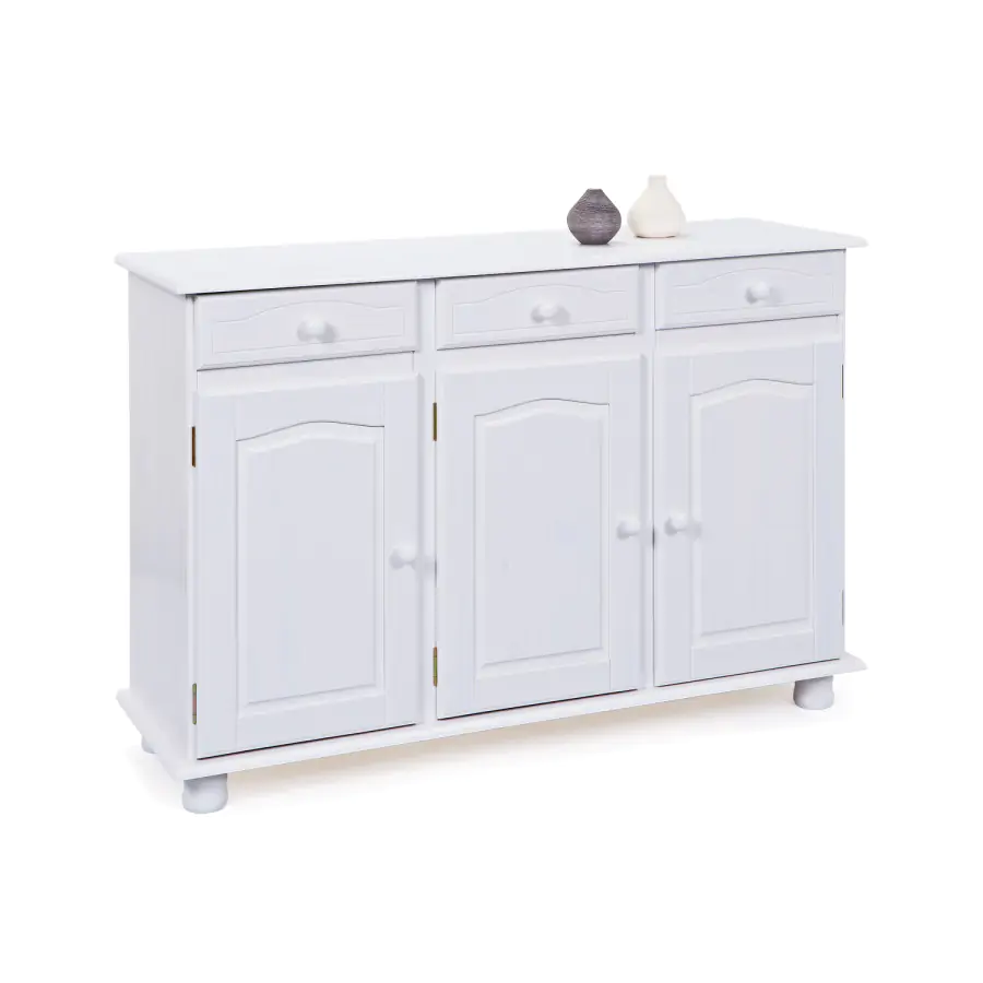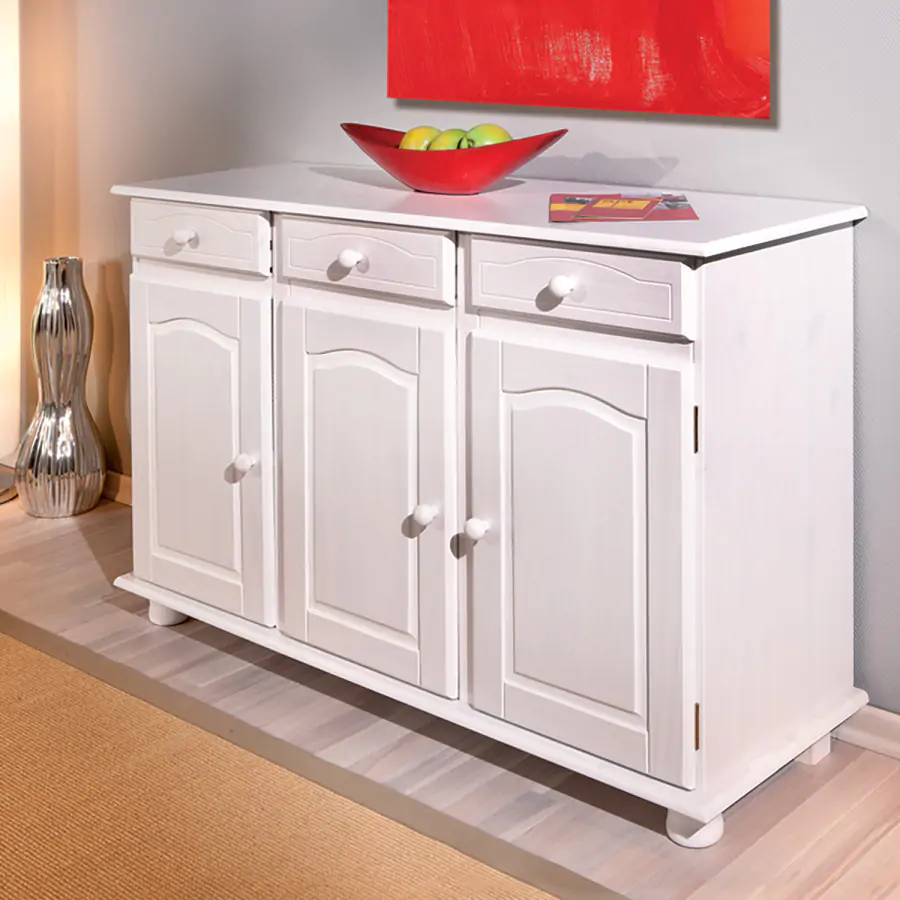 Provedení: Komoda Livio je vyrobena z masivní borovice, barevné provedení bílý lak. Komoda sestává ze třech zásuvek s kovovými pojezdy a trojích dvířek, za nimiž se nachází variabilně nastavitelné police. Zboží je dodáváno v demontu. UPOZORNĚNÍ: bílý lak nezakrývá přirozenou kresbu a strukturu dřeva – ta zůstává po nalakování viditelná. Nejedná se o plně krycí nátěr, ale o povrchovou úpravu, která ponechává dřevu jeho charakter.