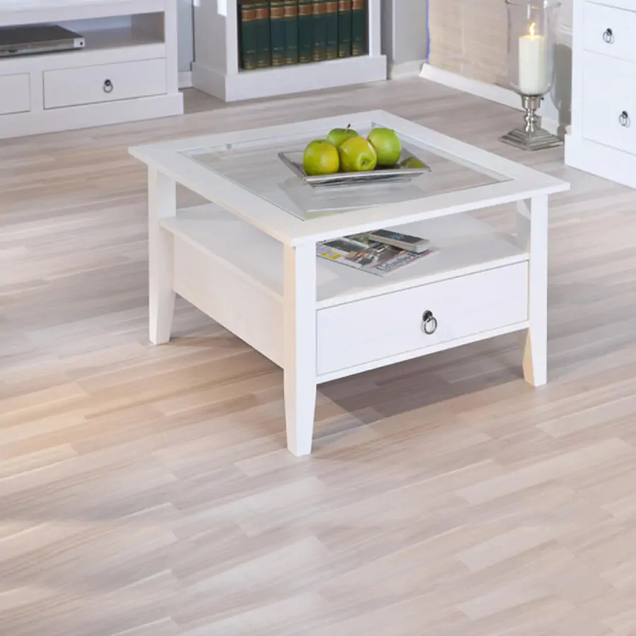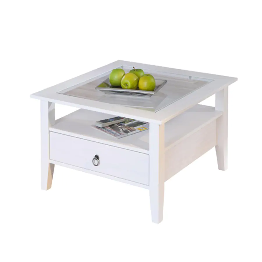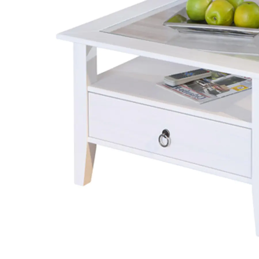 Stylová konferenční stolek z masivní borovice v barevném provedení bílý lak. Horní deska je z tvrzeného skla. Stolek má praktickou zásuvku s kovovou úchytkou. Dodáváno v demontu.