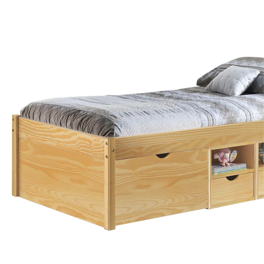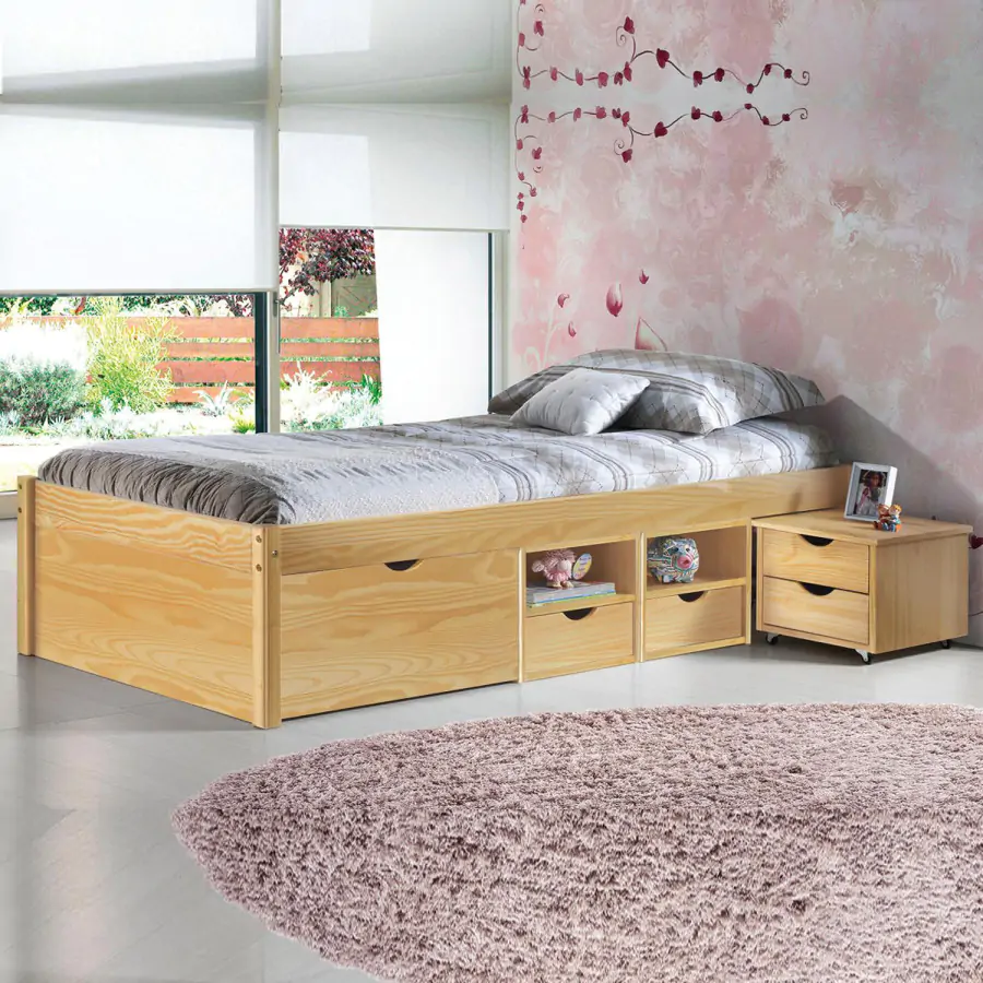 Provedení: Jednolůžková postel CLAAS je vyrobena z masivní borovice lakované v přírodním odstínu dřeva. Tato postel disponuje praktickými úložnými prostory pod postelí a výsuvným nočním stolkem. Cena této postele je uvedena včetně nočního stolku a roštu. V ceně není zahrnuta matrace. V naší nabídce najdete široký výběr matrací. K roštu doporučujeme zakoupit matraci o rozměru 90x200 cm. Dodáváno v demontu.