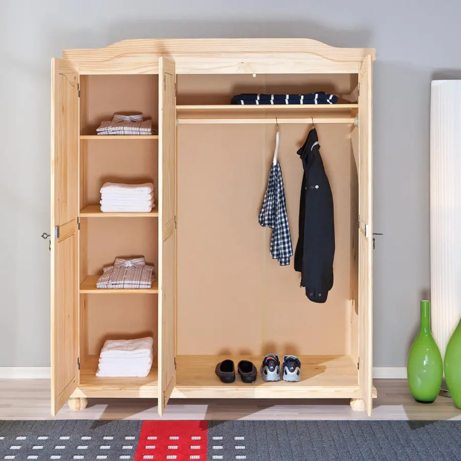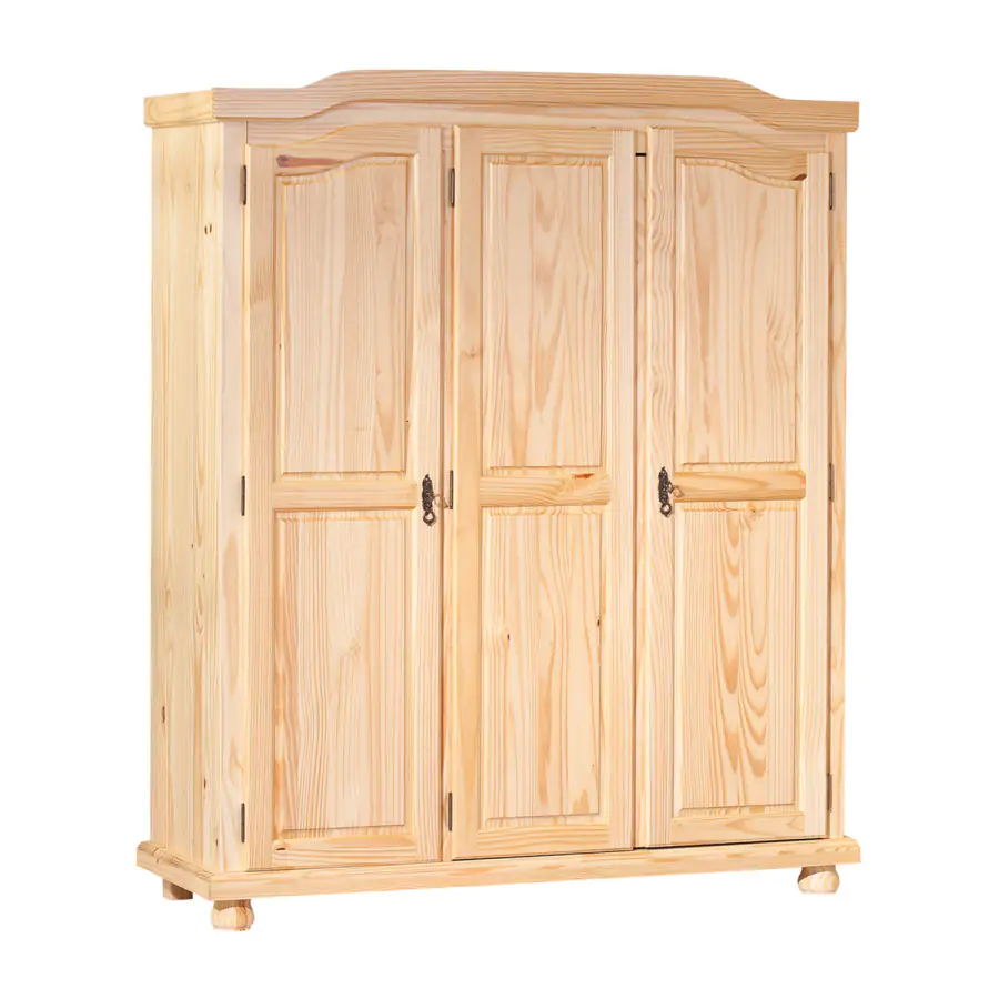 Šatní skříň z masivní borovice vyrobena v lakovaném provedení. Prostor skříně je dělený v poměru 2:1, širší část obsahuje šatní tyč a police, užší část 3 variabilní police. Dodáváno v demontu.