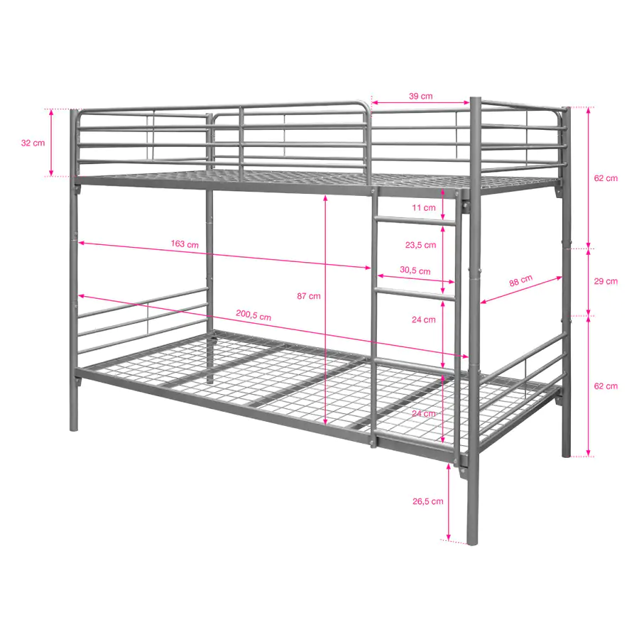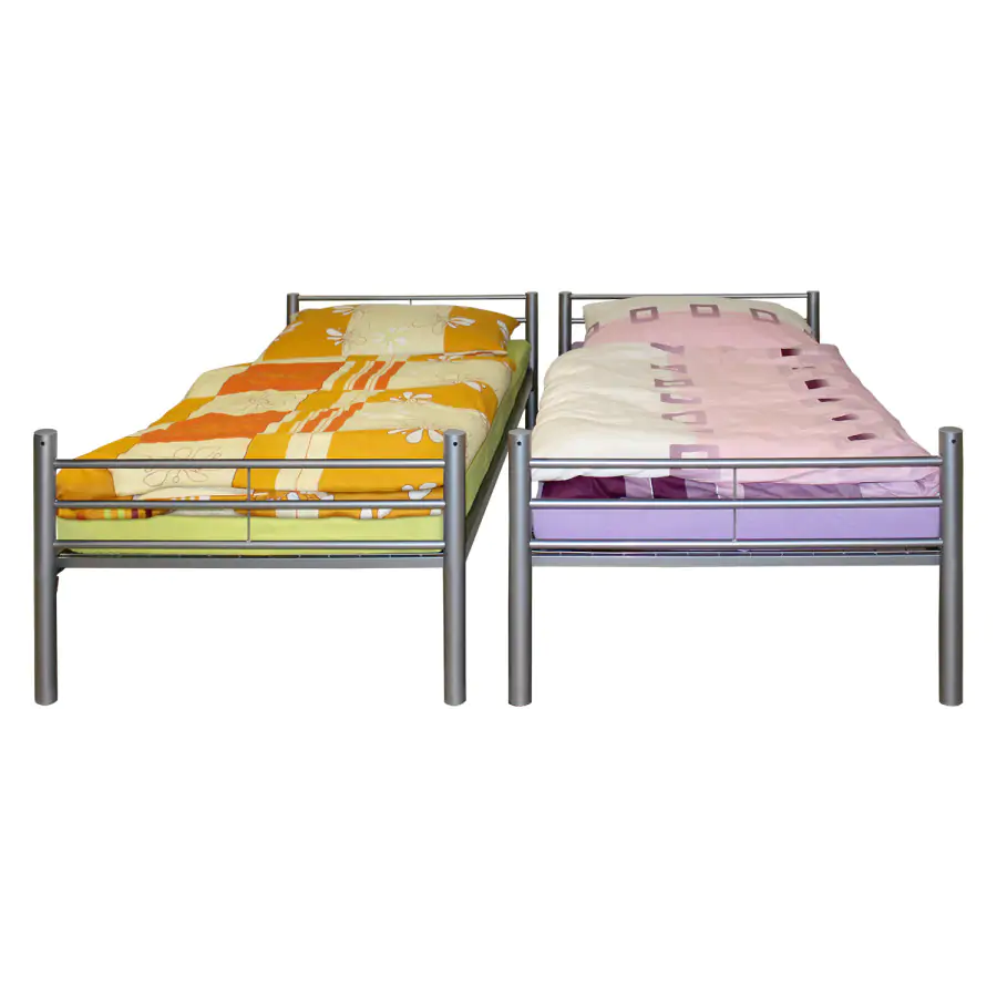 Dvoupatrová postel s kovovou konstrukcí v barevném provedení stříbrná. Možnost rozložení na dvě stejné postele, nosnost jedné postele 140 kg. Kovové rošty jsou součástí postele. Postel je dodávána bez matrace, matraci v rozměru 90x200 cm ze dokoupit zvlášť. Dodáváno v demontu.