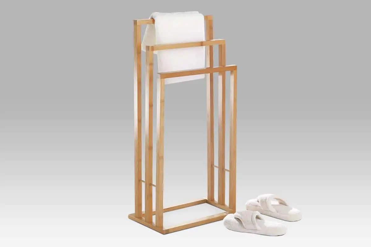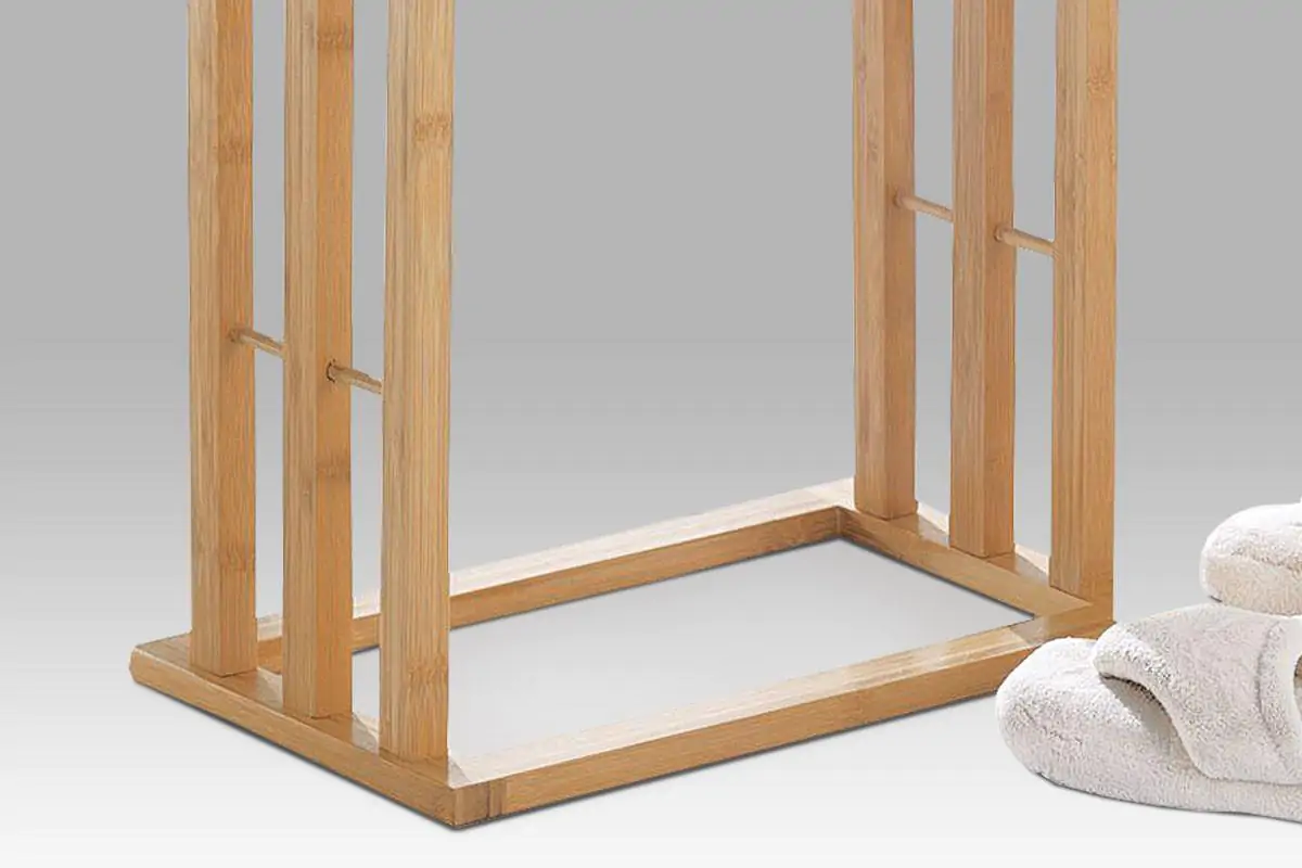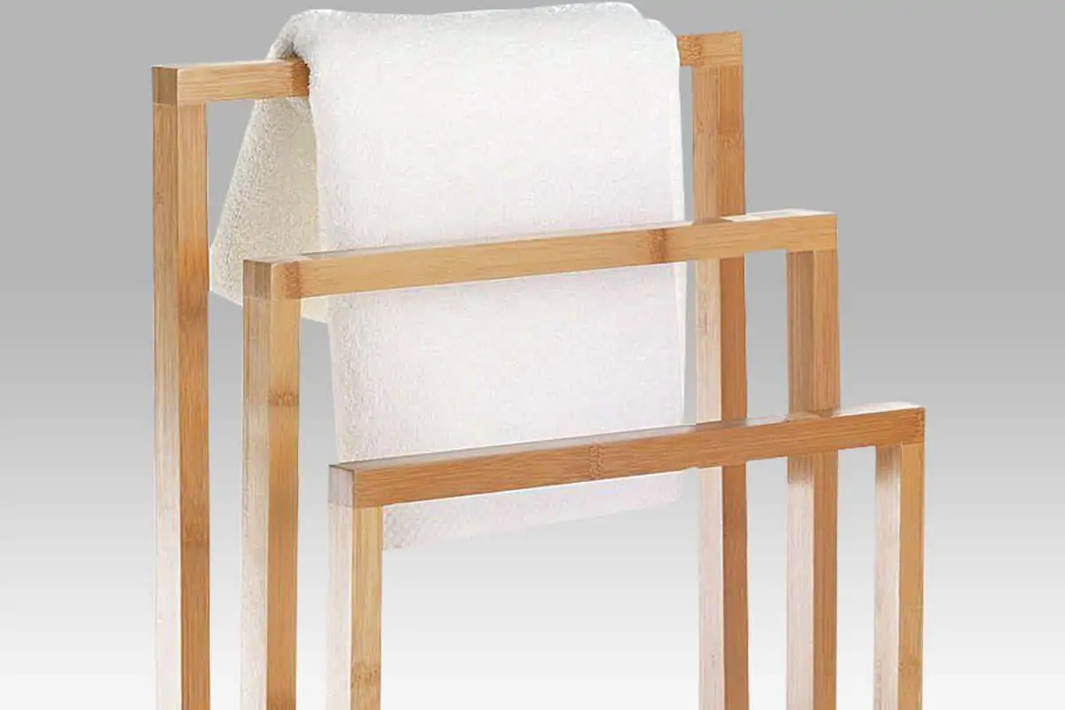 Praktický stojan na ručníky z bambusu, který nejen že bude spolehlivým pomocníkem, ale také pohledným doplňkem, který Vám budou všichni závidět. Na tohoto pomocníka můžete odložit několik ručníků či osušek Rozměr: 42x24x82 cm FOTOGRAFIE JE ILUSTRAČNÍ! HORNÍ DÍLY JSOU SPOJENÉ ŠROUBY.