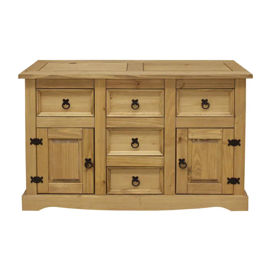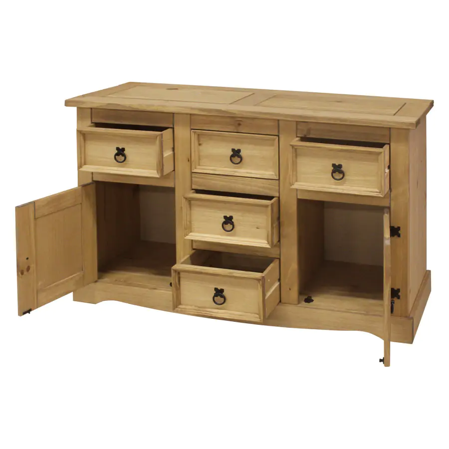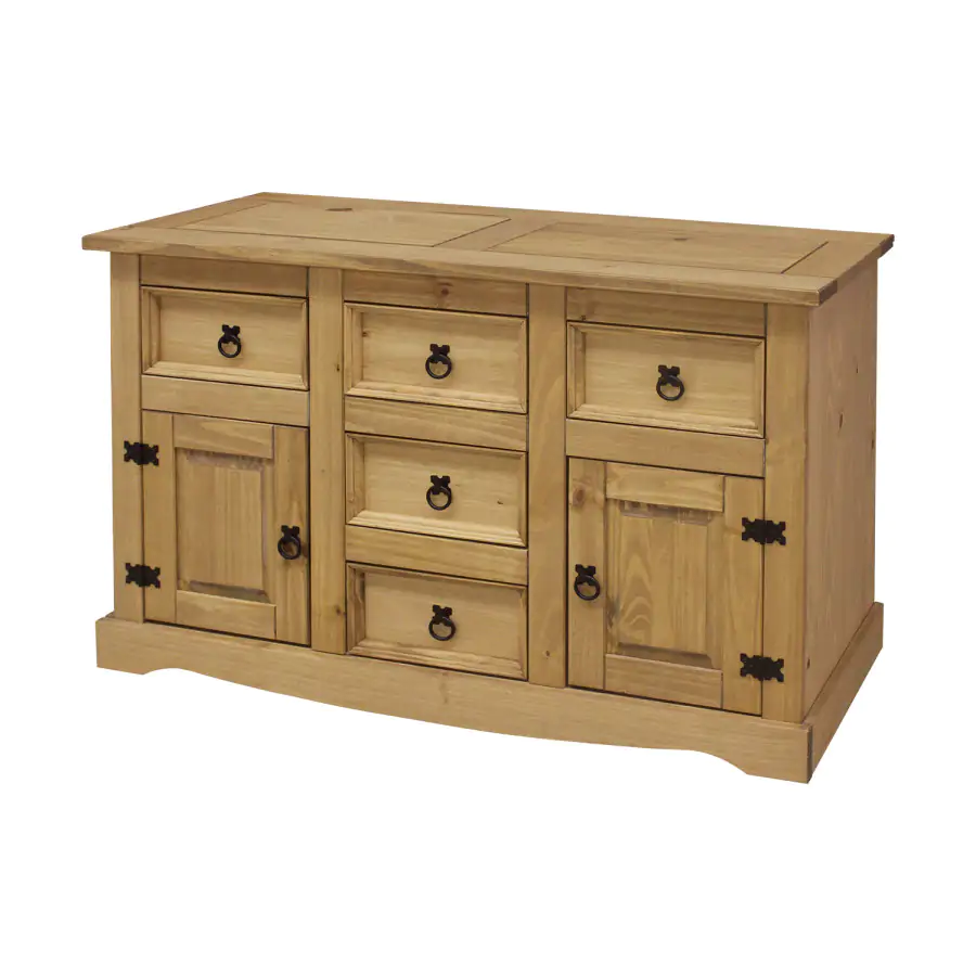 Provedení: Elegantní komoda CORONA je zhotovena z masivní borovice voskované do medového odstínu. Komoda se skládá pěti praktických zásuvek a dvojích dvířek. Zásuvky i dvířka jsou zakončeny kovovými ozdobnými úchytkami. Tato prostorná komoda najde své uplatnění v moderním i tradičním interiéru obývacích pokojů, jídelen apod. Dodávána v demontu.