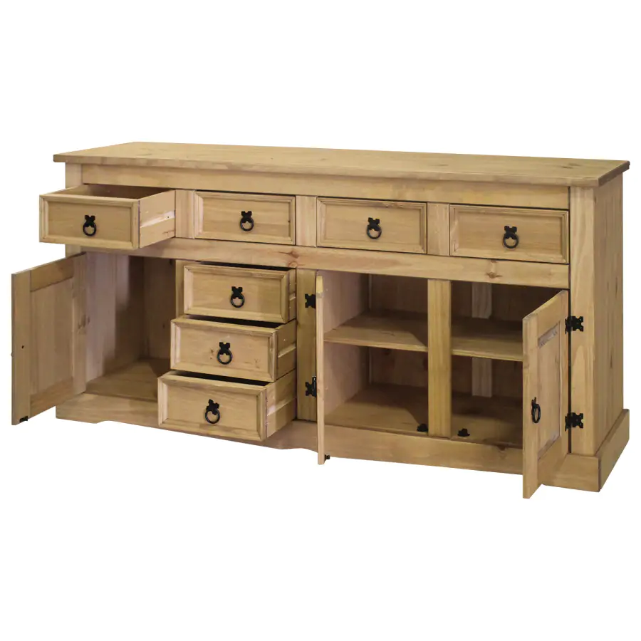 Provedení: Komoda je vyrobená z borovicového masivu, který je povrchově zakončen voskem v medovém odstínu. Dekorační transparentní vosky odpuzují vodu a nečistoty. Ve spodní části této komody se nachází troje dvířka. Za pravými dvířky najdeme jednu polici. Mezi dvířky a celou horní část tvoří sedm menších zásuvek. Veškerá dvířka a zásuvky zakončují kovové ozdobné úchytky. Díky své hloubce má široké využití i v užších prostorech. Komoda je dodávána v demontu.