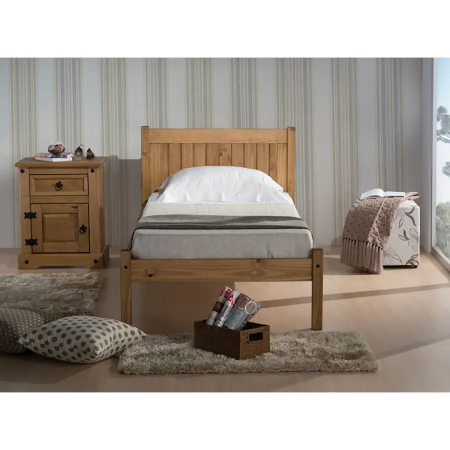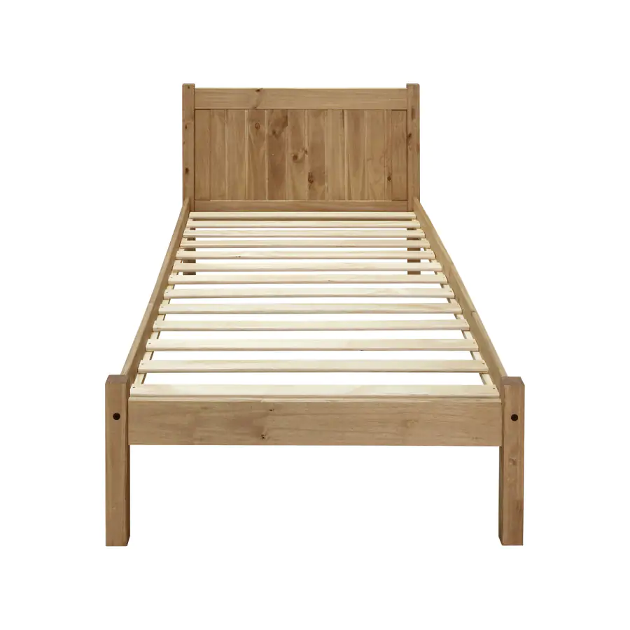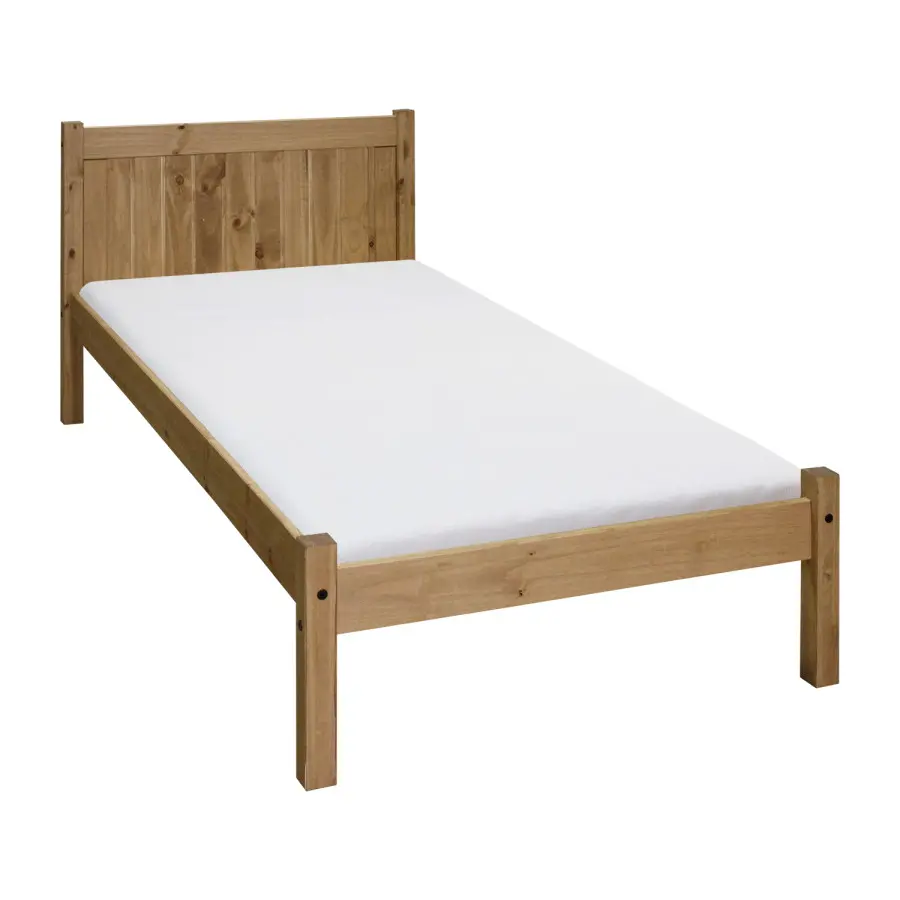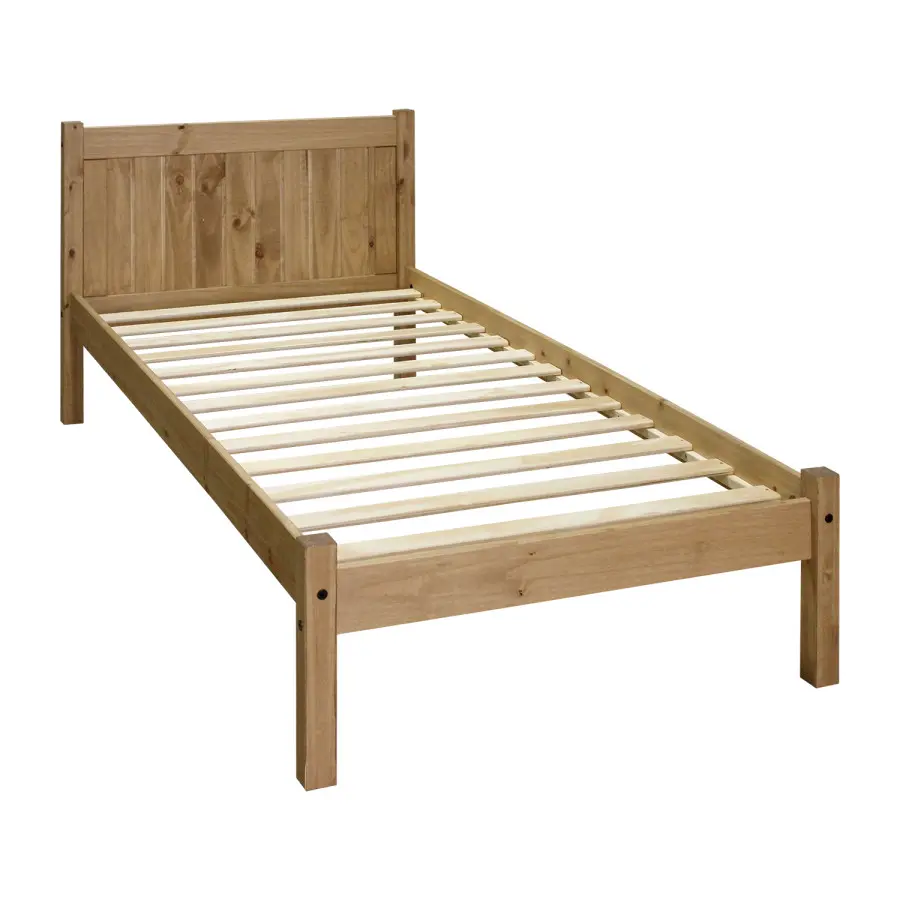 Provedení: Jednolůžko CORONA RIO v rozměru 90x200 cm v provedení masiv borovice je voskováno v krásném medovém odstínu a nabízí vám velkorysý prostor pro odpočinek. Pevná postel s vysokým čelem se bude zamlouvat všem, kteří milují kvalitní nábytek. Součástí postele je rošt. Dvoulůžko CORONA RIO využijete také na chalupě či chatě, kde krásně doplní i původní nábytek. Zboží je dodáváno v demontu. Výška od země po rošt je 30 cm