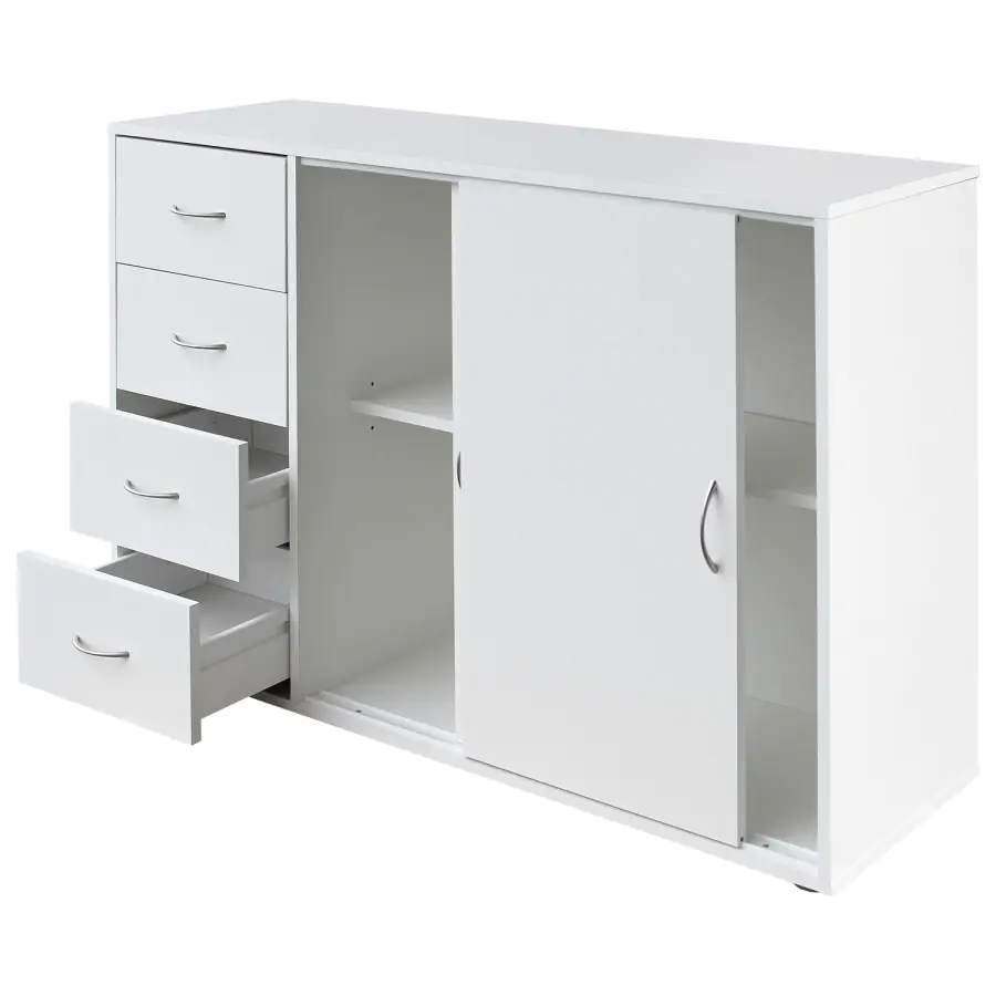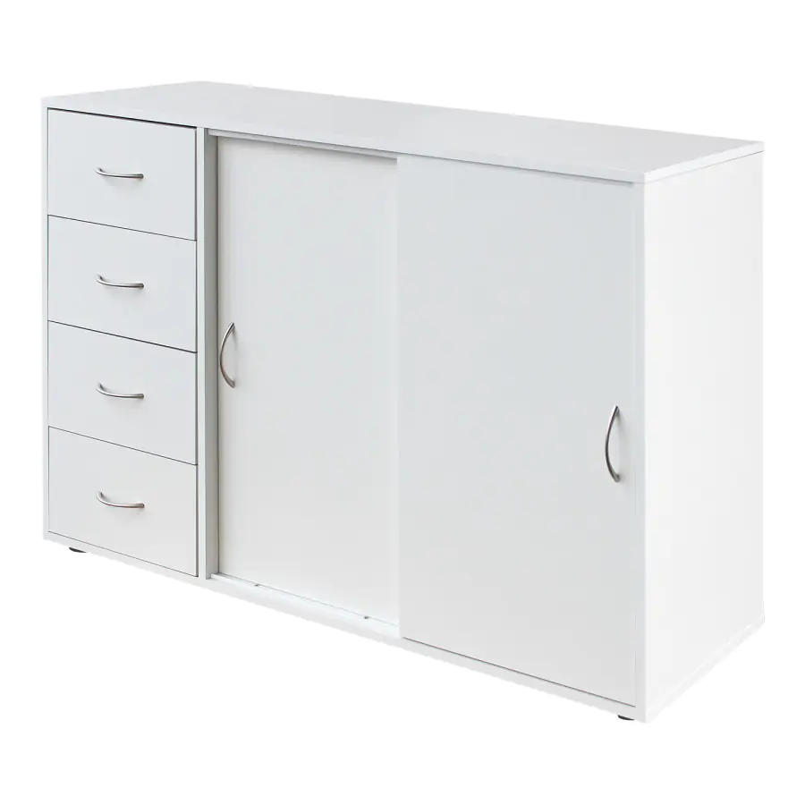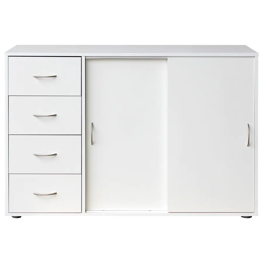 Provedení: Elegantní komoda je zhotovena z laminované dřevotřísky v bílé barvě. V levé části disponuje komoda zásuvkami. Střední a pravá část se skládá z dvířek ukrývajících variabilně nastavitelnou polici. Tato prostorná komoda najde své uplatnění v moderním i tradičním interiéru obývacích pokojů, jídelen apod. Dodávána v demontu.
