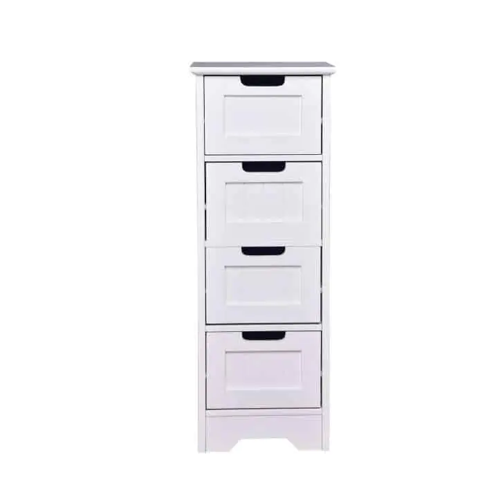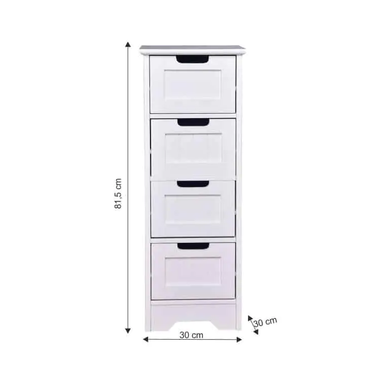 4-šuplíková komoda ATENE TYP 7. Je zhotovena z MDF v bílé barvě. Do 4 šuplíků můžete uložit vše potřebné, od hygienických potřeb po ručníky nebo různou kosmetiku. Přední čela šuplíků mají vyřezané otvory, které nahrazují úchytky. Dodávaná v demontu.