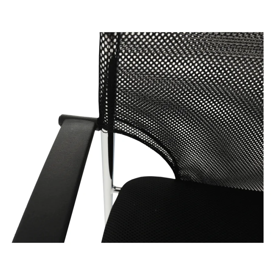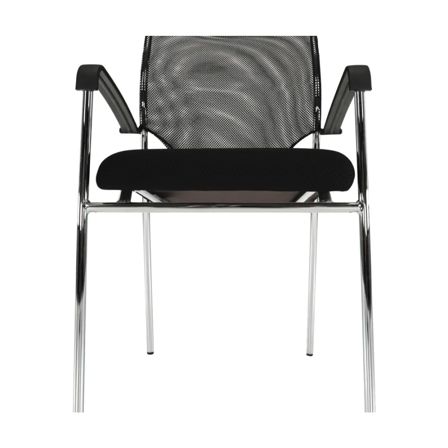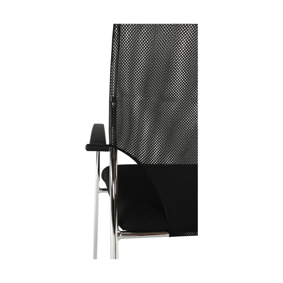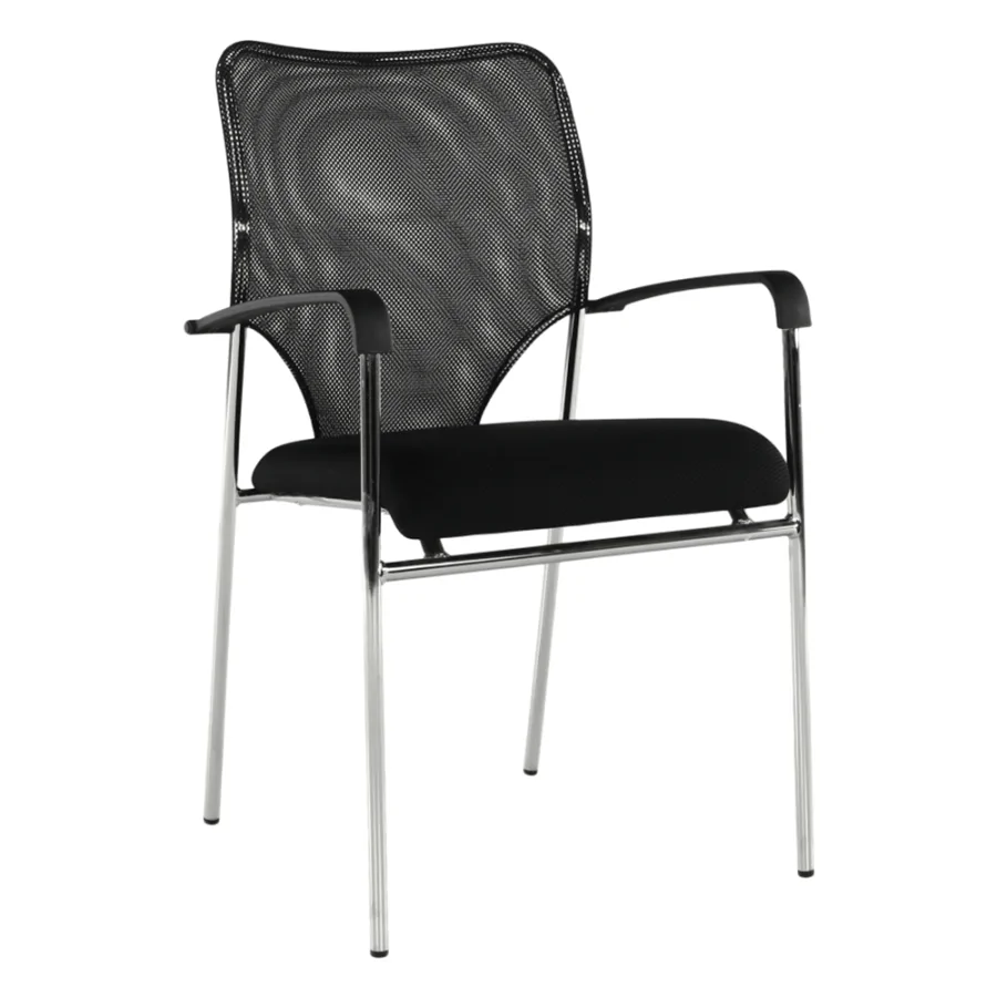 Konferenční židle s plastovými opěrkami rukou v jednoduchém moderním designu. Konstrukci tvoří pevný kov v barvě chromu. Potažena je černou síťovinou. Židle jsou stohovatelné. Hloubka sedu: 46 cm Šířka sedu: 46 cm Výška zádové opěrky: 46 cm Šířka zádové opěrky: 45 cm Dodávaná v demontu.