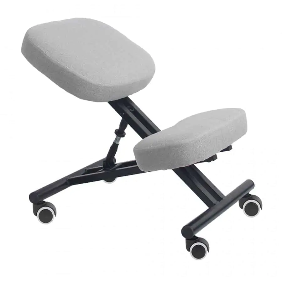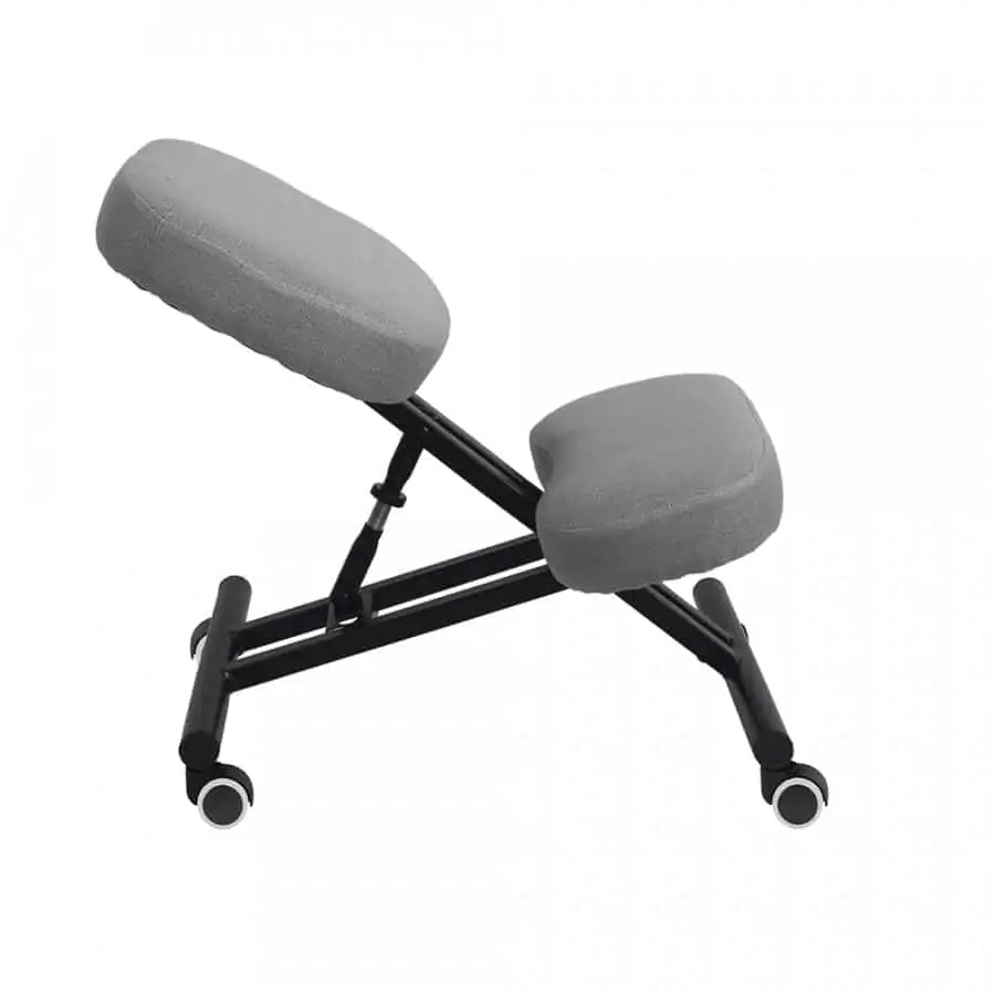 Ergonomická klekačka / klekací židle pro zdravější sezení. Díky správnému úhlu pánve je klekačka vhodná pro všechny, kteří mají problémy s bolestí zad díky nesprávnému sezení na židli a hrbení se. Klekačka donutí každého k sezení s rovnými zády, staženým břichem a vypnutou hrudí. Konstrukce z černého kovu zaručuje stabilitu a dlouhou životnost. Je čalouněna šedou látkou. Nastavitelná výška sedu a opěrky na ruce. Pogumovaná kolečka ochrání dřevěnou a plovoucí podlahu před poškrábáním. Doporučujeme střídat sezení na klasické kancelářské židli a klekačce. Výška sedu: 30-45 cm Hloubka sedu: 30 cm Šířka sedu: 35 cm Šířka zádové opěrky: 35 cm Dodávaná v demontu.