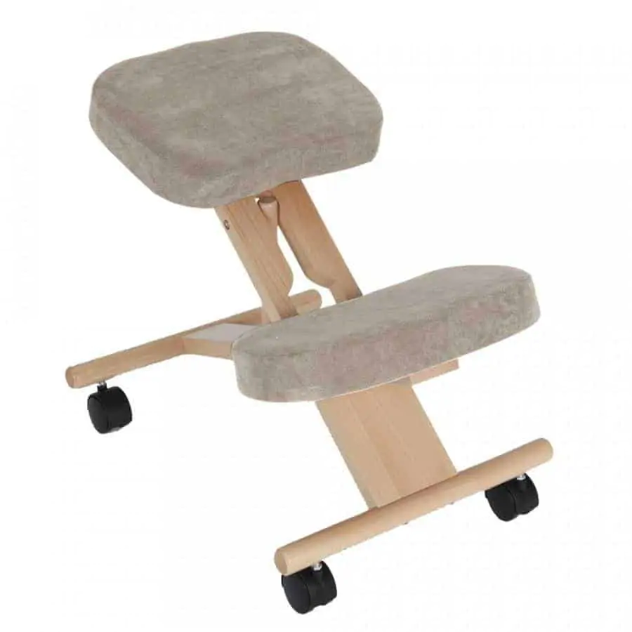 Ergonomická klekačka / klekací židle pro zdravější sezení. Díky správnému úhlu pánve je klekačka vhodná pro všechny, kteří mají problémy s bolestí zad díky nesprávnému sezení na židli a hrbení se. Klekačka donutí každého k sezení s rovnými zády, staženým břichem a vypnutou hrudí. Konstrukce z bukového dřeva zaručuje stabilitu. Je čalouněna šedohnědou látkou Taupe. Nastavitelná výška sedu. Výška sedu: 52-72 cm Hloubka sedu: 30 cm Šířka sedu: 40 cm Dodávaná v demontu. Mechanické, ruční výškové nastavení sedu. Klekačka má černá plastová kolečka vhodná na koberce. Doporučujeme střídat sezení na klasické kancelářské židli a klekačce.
