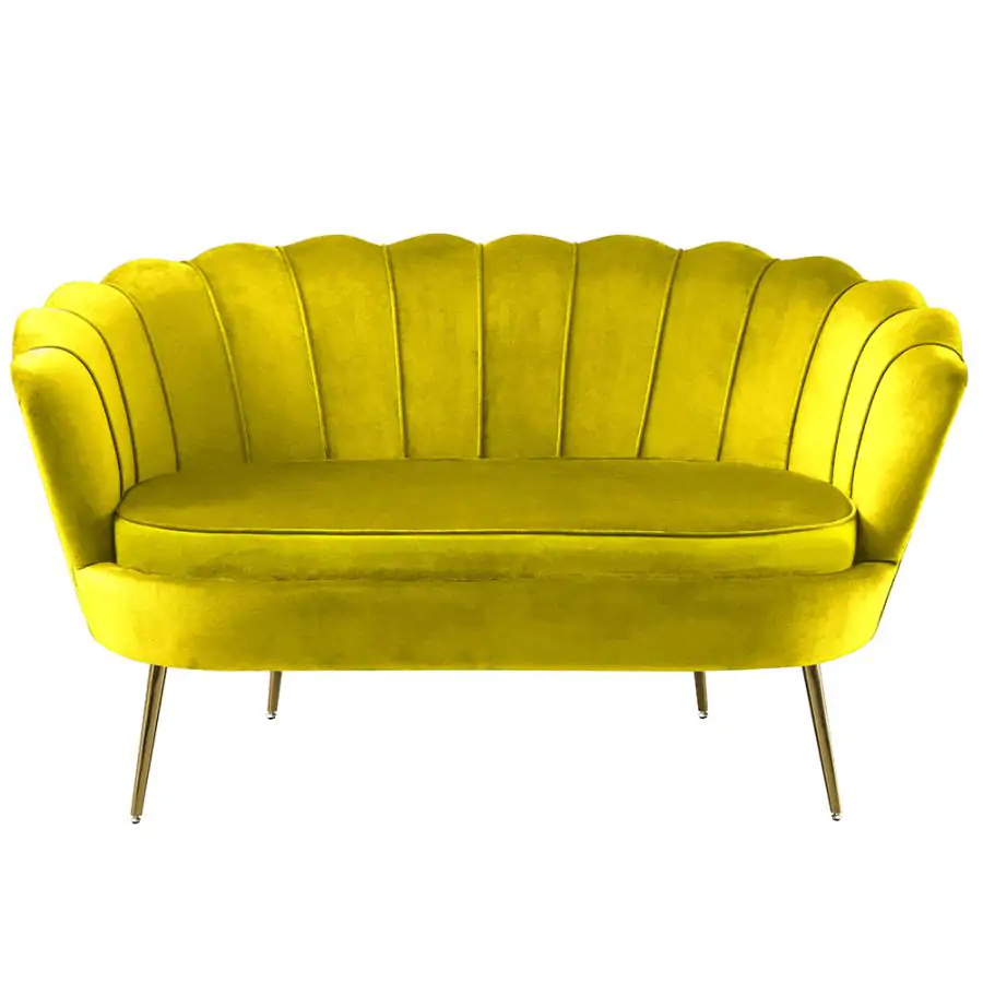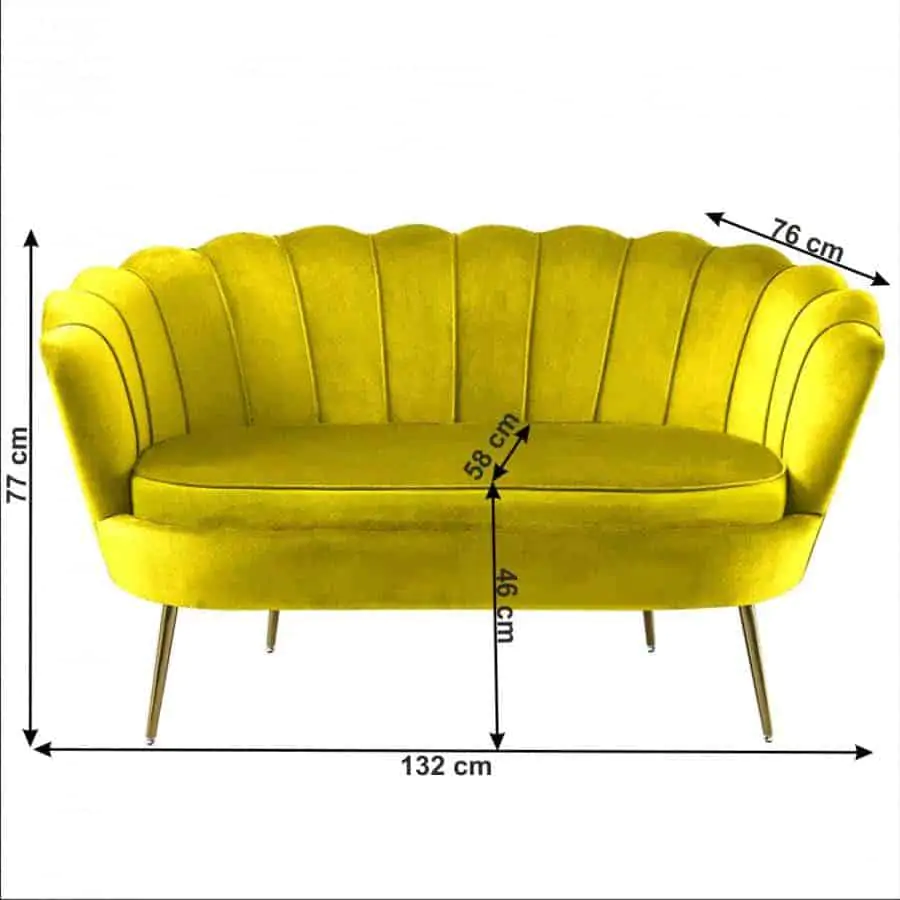 Elegantní dvojsedák ve tvaru mušle se hodí do obývacího pokoje, ložnice, pracovny apod. Je čalouněný hořčicovou sametovou látkou Velvet, nožičky jsou z chromované oceli ve zlaté barvě. Výška sedu: 46 cm Hloubka sedu: 58 cm Dodávaný v demontu. V nabídce máme k tomuto dvojsedáku také křeslo Noblin ve stejném designu.