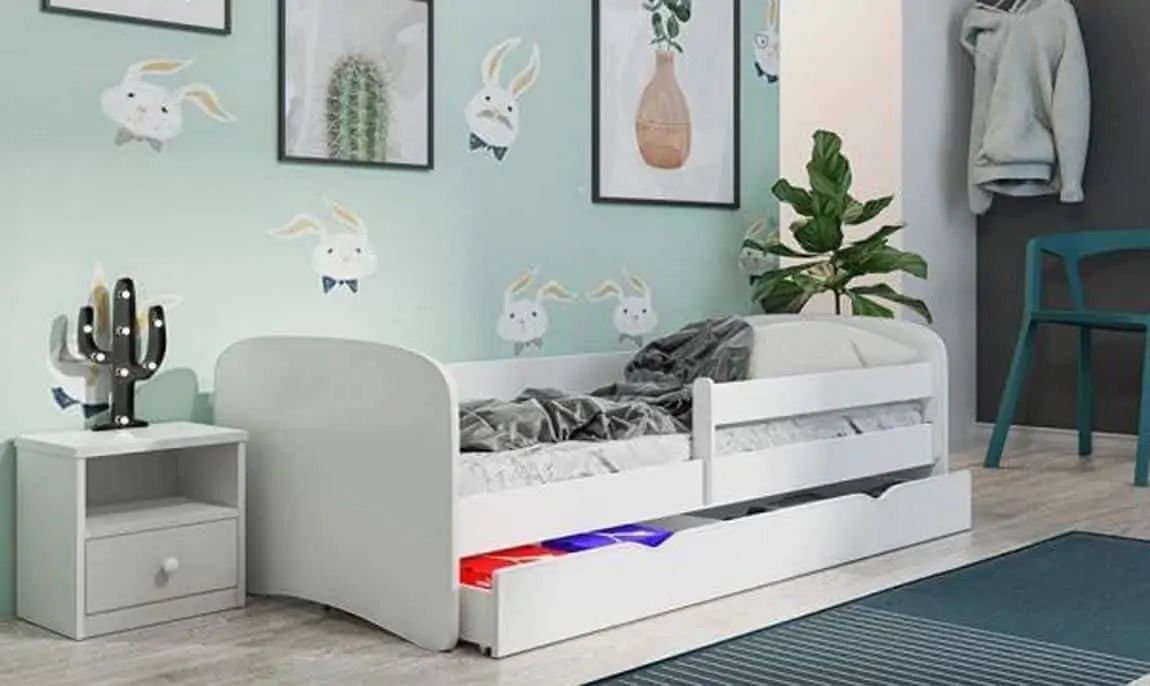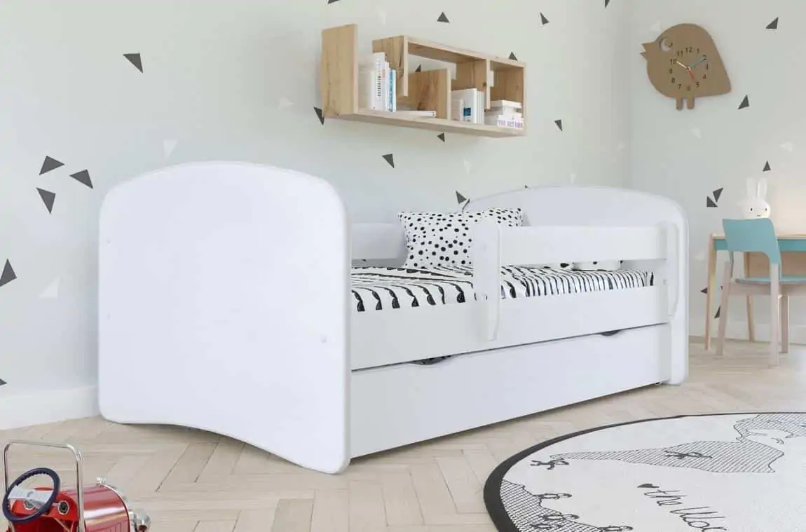 Dětská postel s úložným prostorem v bílém barveném provedení. Úložný prostor se nachází pod zvedacím lamelovým roštem a spací plochou 200×90 cm. Praktické provedení postele zaručuje bezpečnostní zábranu proti pádu z postele. Součásti postele je rošt z bukového dřeva a praktický úložný prostor. Ten je snadno přístupný díky výsuvnému šuplíku s kolečky. Vyrobeno z LTD. Součástí postele není matrace, doporučujeme dokoupit rozměr 200×90 cm. Dodáváme v demontovaném stavu. Tip: Pořiďte si k posteli rovnou i noční stolek.