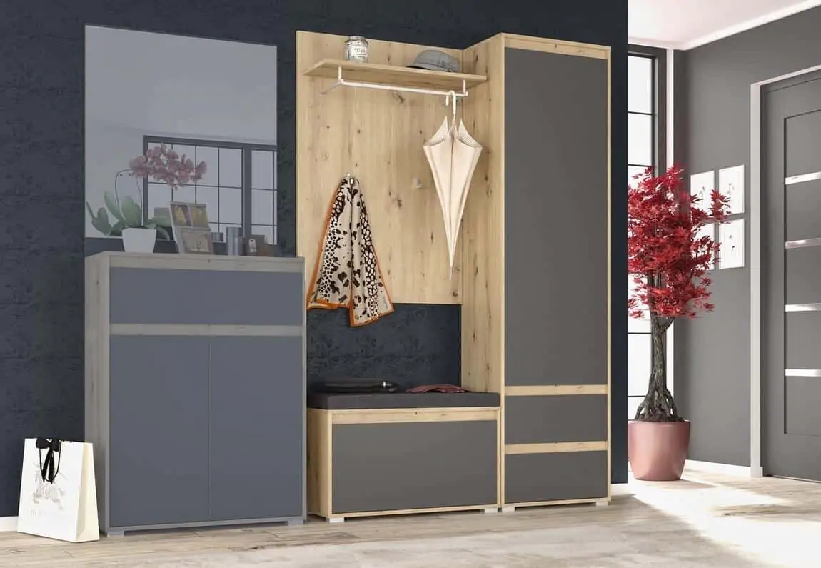 Moderní předsíňová sestava ARBORETO SET 1 dub artisan/šedá disponuje velkým úložným prostorem. Vyrobena je z kvalitní laminátové desky. Kombinace barev je dub artisan, čela dvířek a zásuvek jsou v barvě šedá. Sestava se skládá z těchto komponentů o rozměrech ( Š x V x H cm ):Šatní skříň se dvěma zásuvkami ( 54,1 x 196,5 x 35 )Botník ( 76,1 x 43,5 x 35 )Věšáková stěna s policí ( 76 x 110 x 26,5 ). Dodáváme v demontovaném stavu.