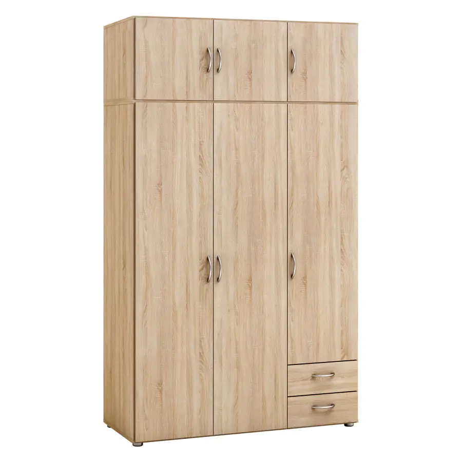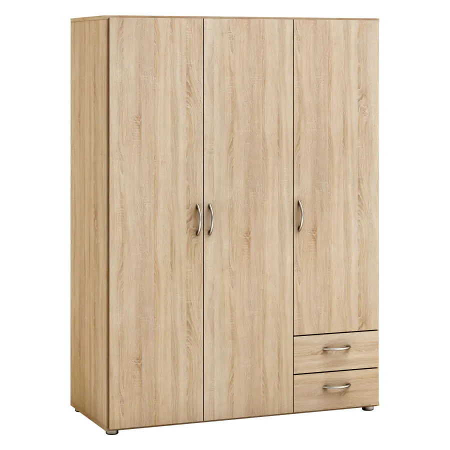 Skříň 3dveřová BEST v barevném provedení dub sonoma se bude hodit do všech místností vybavených nábytkem ve stejném barevném provedení. Šatní skříň je dělena v poměru 2:1. Její širší část pojme, díky pevné šatní tyči, všechny vaše svršky zavěšené na ramínkách. Užší část obsahuje dvě variabilní police a dvě praktické zásuvky, které oceníte především k uložení prádla a ponožek. Tloušťka lamina 1,5 cm. Dodáváno v demontu.