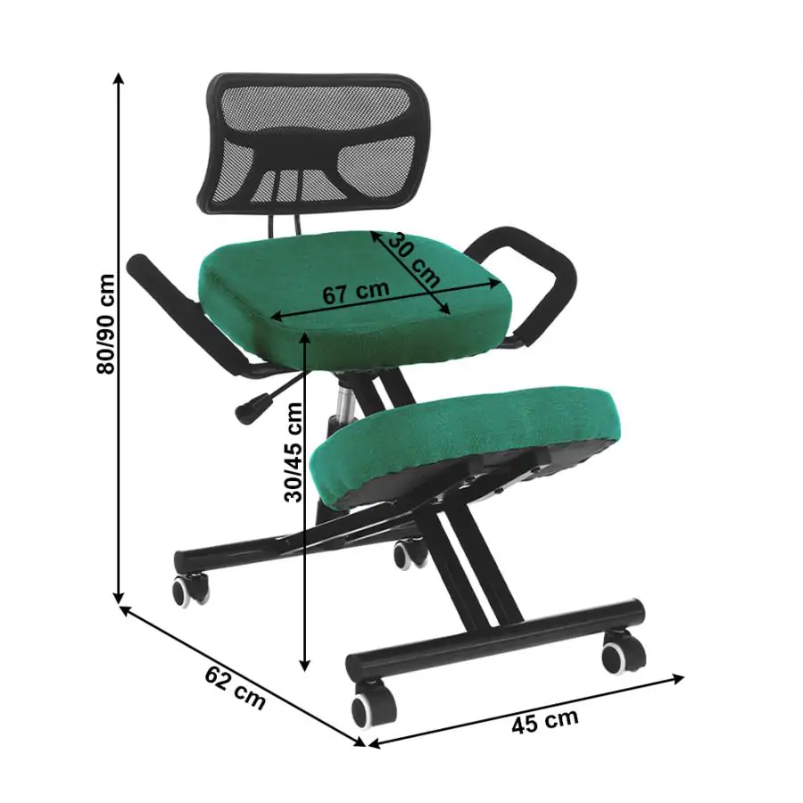 Ergonomická klekačka / klekací židle pro zdravější sezení. Díky správnému úhlu pánve je klekačka vhodná pro všechny, kteří mají problémy s bolestí zad díky nesprávnému sezení na židli a hrbení se. Klekačka donutí každého k sezení s rovnými zády, staženým břichem a vypnutou hrudí. Konstrukce z černého kovu zaručuje stabilitu a dlouhou životnost. Je čalouněna zelenou látkou. Nastavitelná výška sedu a opěrky na ruce. Pro ještě větší komfort při sezení je součástí bederní opěrka. Univerzální kolečka vhodná pro měkké i tvrdé podlahy. Doporučujeme střídat sezení na klasické kancelářské židli a klekačce. Výška sedu: 45-55 cm Hloubka sedu: 30 cm Šířka sedu: 35 cm Šířka zádové opěrky: 35 cm Výška zádové opěrky: 28 cm Dodávaná v demontu.
