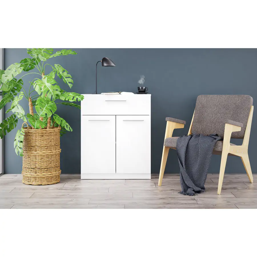 Komoda SURREY má 1 zásuvku s kovovými pojezdy a dvoje dveře. Je v barevném provedení bílé barvy. Poskytne vám tedy spoustu úložného prostoru, jak na vaše prádlo, tak na dokumenty či jiné doplňky. Komodu je možné doplnit i o další produkty z nábytkové řady Surrey. Dodáváno v demontu.
