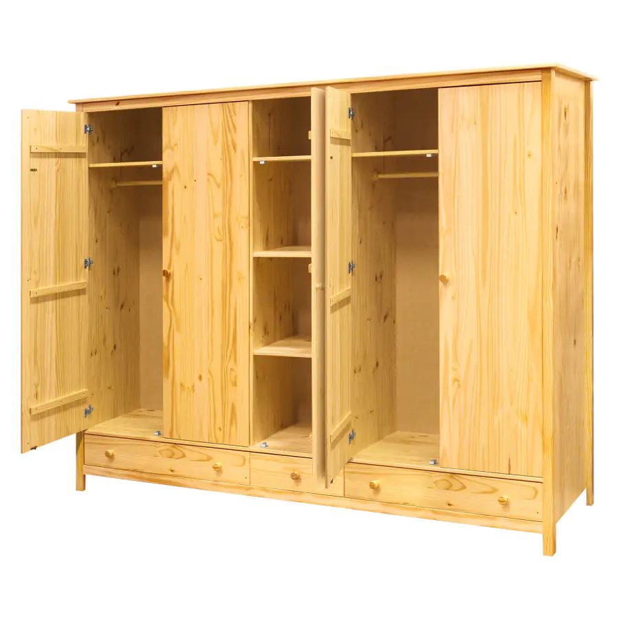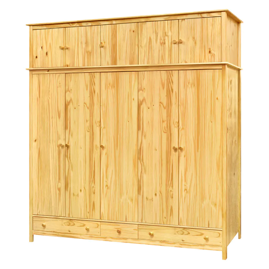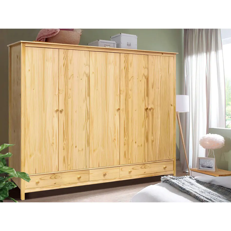 Pokud jste vícečlenná rodina, nebo jen zkrátka milujete módu a máte hodně oblečení, tak skříň je 5dveřová TORINO přesně pro vás. Je z masivní borovice v lakovaném provedení. Prostor ve skříni je dělaný v poměru 2:1:2. V levé a pravé širší části se nachází prostorná šatní tyč a police na sezónní oblečení, či klobouky nebo čepice. Ve střední úzké části se nachází 3 police na uložení triček a svetrů. A ve spodní části najdete 3 zásuvky s kovovými pojezdy, takže jsou ideálním místem kam můžete uložit vaše spodní prádlo. Jelikož je skříň opravdu velmi prostorná, určitě v ní najdete místo i na ložní prádlo. Dodávané v demontu. A pokud by vám přece jen byla skříň málo, můžete ji doplnit prádelníkem nebo stojanem na šaty. Tip: Aby vám vše hezky ladilo můžete byt doplnit dalším nábytkem z řady TORINO.