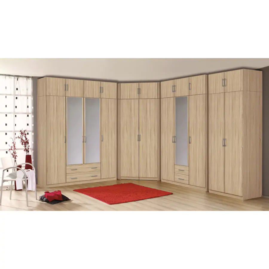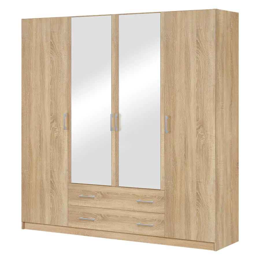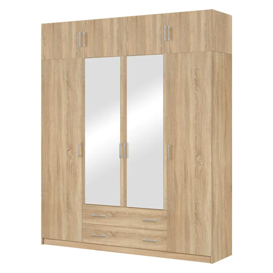 Skříň ESO 4 dveřová 51540 v provedení dub je ideální skříní pro může i ženu. Je totiž tak akorát veliká a prostorná pro oba dva. Je vybavená 2 zrcadly, tudíž si každý může kontrolovat outfit ve svém zrcadle. Po bocích se nachází plné dveře a v dolní části skříně jsou dvě zásuvky. Ve všech třech částech je umístěná šatní tyč pro zavěšení oblečení na ramínka. Zbytek je pak doplněn o police, kam si lze uložit zbylé oblečení včetně doplňků. Zásuvky pak lze využít na uskladnění spodního prádla. prostor dělený v poměru 1:2:1 ve střední části dole 2 zásuvky Dodávané v demontu. Tato šatní skříň se dá doplnit o nástavec, který má označení 51540. Je ve stejném dekoru a má také 4 dvířka tak, jako samotná skříň.