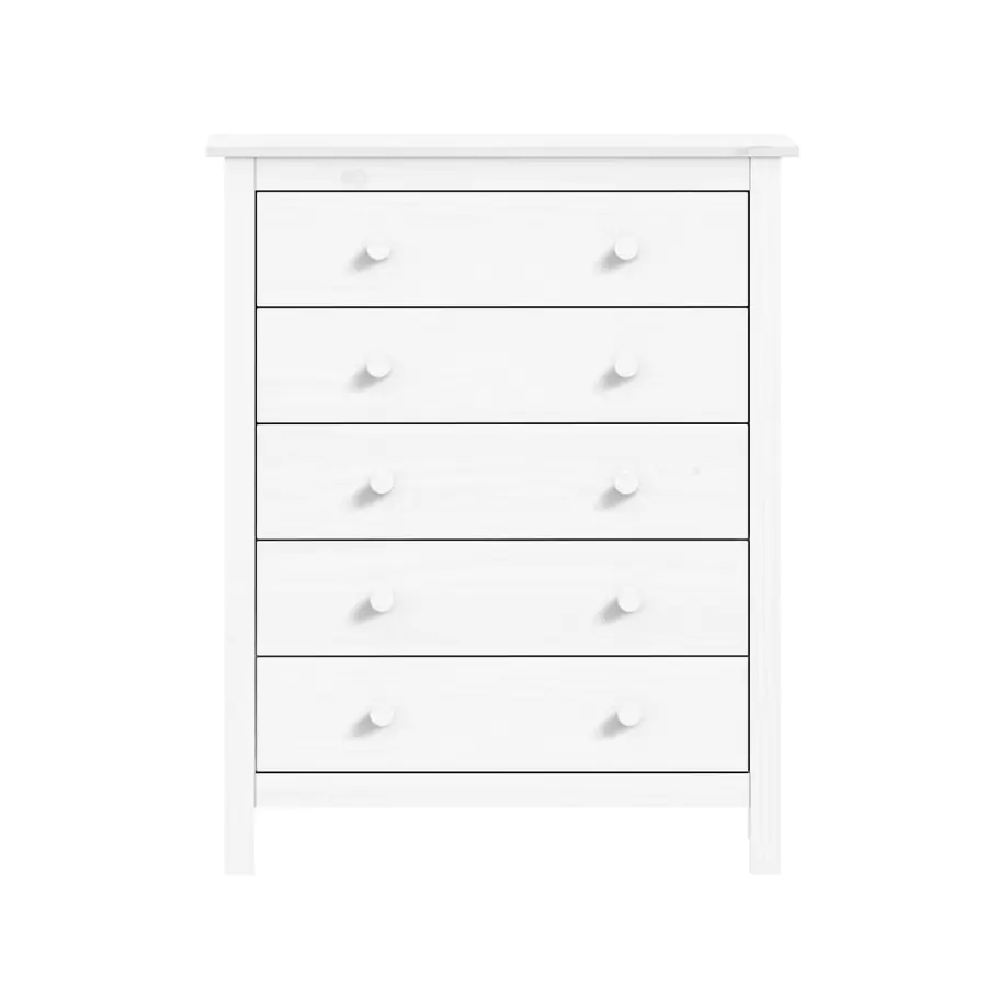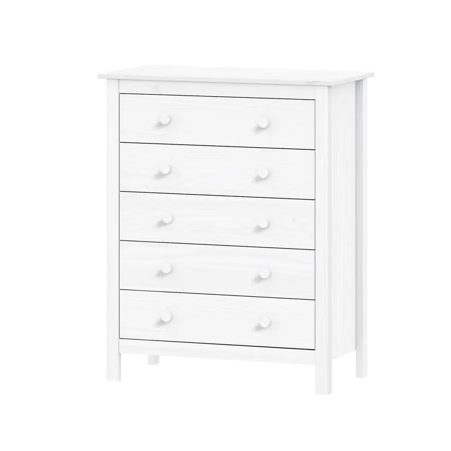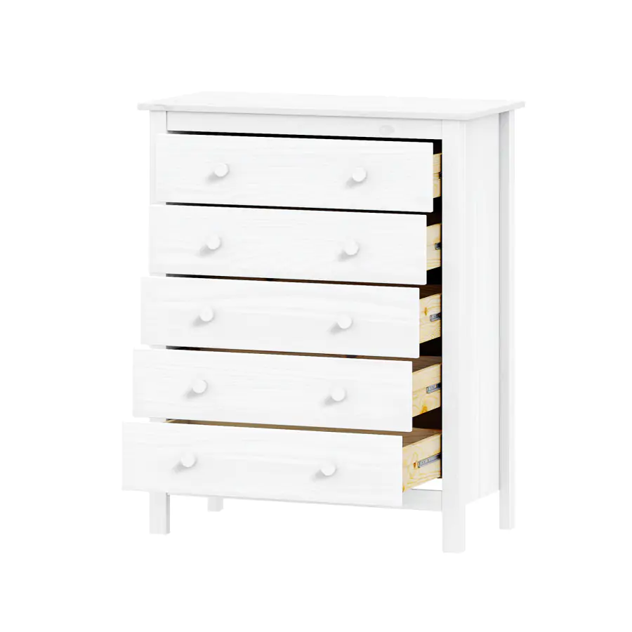 Komoda TORINO 8077B v bílém provedení, s pěti zásuvkami s kovovými pojezdy, nabízí šikovný úložný prostor. Vyrobená z borovice masiv, v bílém lakovaném provedení. Komodu je možné doplnit i o další produkty z nábytkové řady Torino. Dodáváno v demontu. UPOZORNĚNÍ: bílý lak nezakrývá přirozenou kresbu a strukturu dřeva – ta zůstává po nalakování viditelná. Nejedná se o plně krycí nátěr, ale o povrchovou úpravu, která ponechává dřevu jeho charakter.